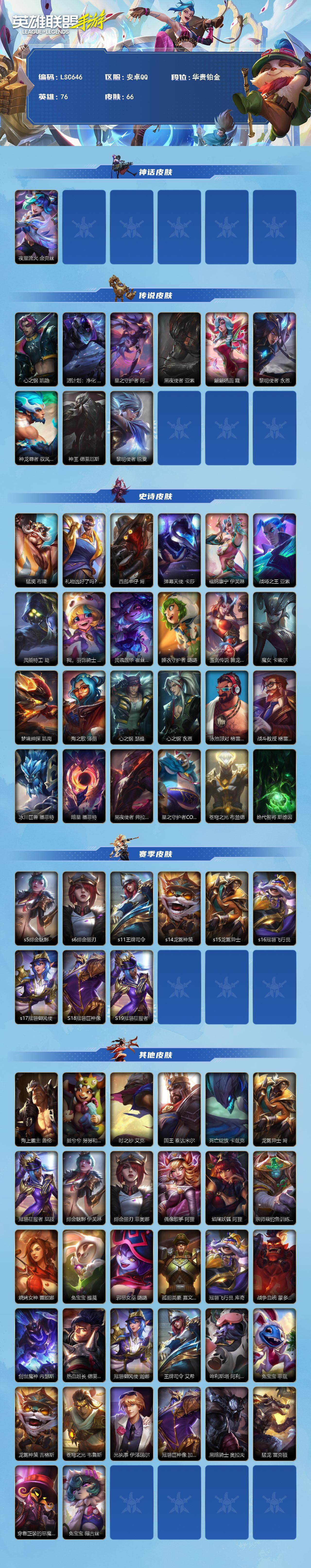 【C2610690251】【LSC646】76英雄/66皮肤/华贵铂金/夜星流火 金克丝/心之钢 凯隐/源计划: 净化/星之守护者 阿卡丽/黑夜使者亚索/翩翩绣蕊 霞/黎明使者 永恩/神龙尊者 驭风啸龙/神王诺手/黎明使者瑞文/猛虎布隆/礼物选好了吗? 布隆/西部牛仔/弹幕天使/福纳康宁 伊芙琳/战场之王亚索/灵能特工劫/我,羽饰骑士 崔丝塔娜/灵魂莲华 崔丝塔娜/睡衣守护者 璐璐/玉剑传说 舞龙卫 希瓦娜/魔女青钢影/梦境绅探 凯南/海之歌泽丽/心之钢 瑟提/心之钢 永恩/泳池派对男枪/战斗教授男枪/冰川巨兽石头人/暗星 墨菲特/黑夜使者 弗拉基米尔/星之守护者COS 厄加特/苍穹之光火男/绝代智将斯维因/s5绯金魅影/s6绯金丽刃/s11王牌司令/s14龙冕神策/s15龙冕异士/s16冠翎飞行员/s17冠翎御风使/S18冠翎巨神像/S19冠翎征服者/海上霸主/脏兮兮/时之砂/国王/死亡绽放/龙冕异士 烬/冠翎征服者 尼菈/绯金魅影 (可升级)/绯金丽刃(可升级)/偶像歌手/焰尾妖狐/宗师级钓鱼训练师/烧烤女神/免宝宝提莫/邪恶女巫/孤胆英豪/冠翎飞行员 库奇/战争血统/创世魔神/热血班长/冠翎御风使 迦娜/王牌司令 艾希/哞利斯塔/免宝宝菲兹/龙冕神策 吉格斯/苍穹之光 韦鲁斯/光执事EZ/冠翎巨神像 加里奥/黑暗骑士奥拉夫/猛龙 雷克顿/穿着正装的恶魔/兔宝宝 薇古丝