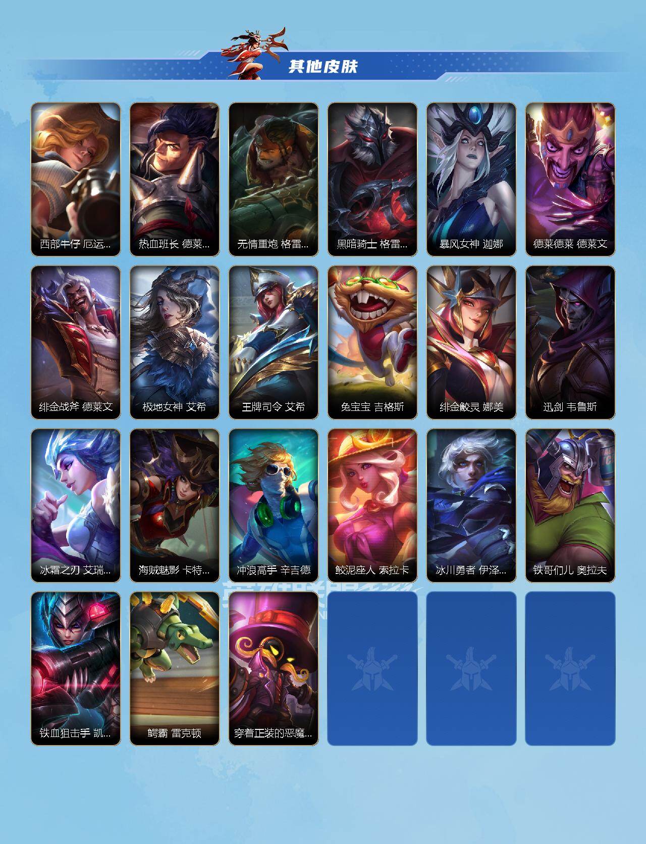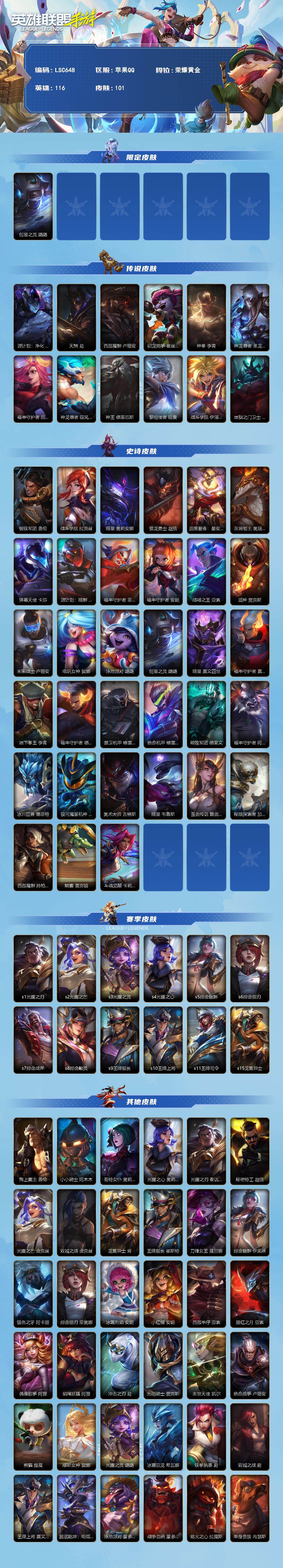 【C2610661553】【LSC648】116英雄/101皮肤/荣耀黄金/创星之灵/源计划: 净化/天煞劫/西部魔影卢锡安/驯龙炮手/神拳盲僧/神龙尊者 圣龙 李青/福牛守护者女枪/神龙尊者 驭风啸龙/神王诺手/黎明使者瑞文/战斗学院ez/地狱之门卫士/钢铁军团/战斗学院拉克丝/暗星发条/猎龙勇士赵信/蕊雪盈春:晏安 赫卡里姆/灰烬领主/弹幕天使/源计划: 暗影/福牛守护者剑姬/福牛守护者安妮/战场之王亚索/武神/未来战士卢锡安/电玩女神琴女/泳池派对 璐璐/暗星皇子/福牛守护者皇子/地下拳王/福牛守护者诺手/禁卫机甲/绝命机甲男枪/破败军团德莱文/福牛守护者牛头/冰川巨兽石头人/银河魔装机神小鱼人/奥术大师吉格斯/暗星维鲁斯/玉剑传说 舞剑仙 艾瑞莉娅/秘旅探索者加里奥/西部魔影 持枪女巫 莎弥拉/鳄霸 雷克顿/斗魂觉醒 卡莉丝塔/s1光耀之刃/s2光耀之芒/s3光耀之灵/s4光耀之心/s5绯金魅影/s6绯金丽刃/s7绯金战斧/s8绯金皎灵/s9王牌舰长/s10王牌上将/s11王牌司令/s15龙冕异士/海上霸主/小小骑士/哥特女仆/光耀之心发条/光耀之刃蛮王/秘密特工/光耀之芒金克斯/双城之战金克斯/龙冕异士 烬/王牌舰长/刀锋女王/绯金魅影 (可升级)/银色之牙/绯金丽刃(可升级)/冰霜烈焰/小红帽/西部牛仔亚索/腥红之月亚索/偶像歌手/焰尾妖狐/冲击之刃劫/光明骑士贾克斯/末世天使/绝命抢手/熊猫/缪斯女神/光耀之灵/冰霜亚龙/铁拳执事/双城之战蔚/王牌上将 嘉文四世/超武乾坤:电弧/泳池派对蒙多/战争血统/熔火之心/单身贵族/西部牛仔女枪/热血班长/无情重炮/黑暗骑士男枪/暴风女神/德莱德莱/绯金战斧 (可升级)/极地女神/王牌司令 艾希/免宝宝炸弹人/绯金鲛灵(可升级)/迅剑/冰霜之刀/海贼魅影/冲浪高手/蕉泥座人/冰川勇者/铁哥们儿奥拉夫/铁血狙击手/鳄霸/穿着正装的恶魔