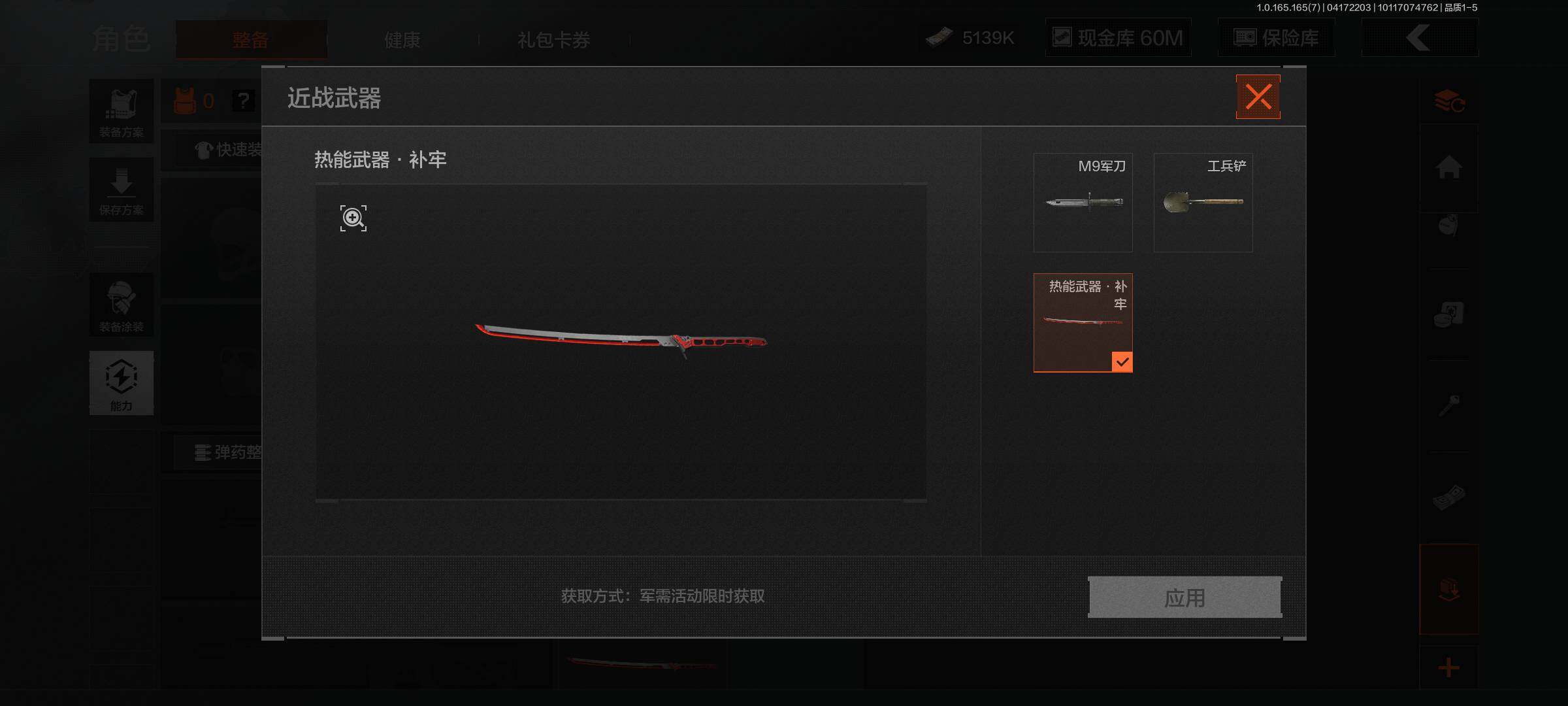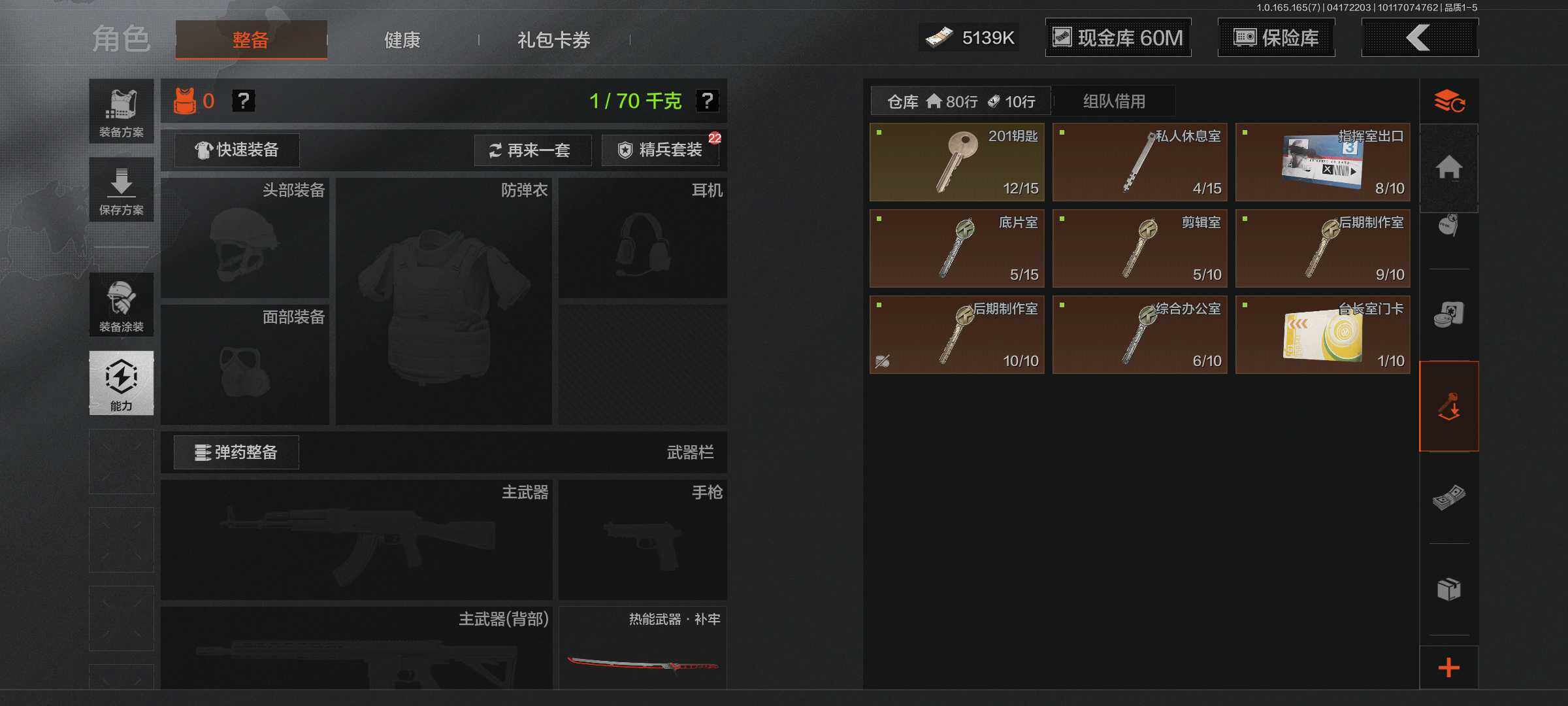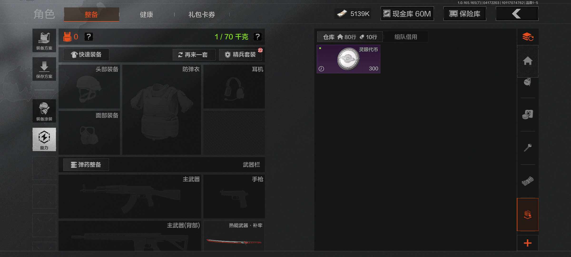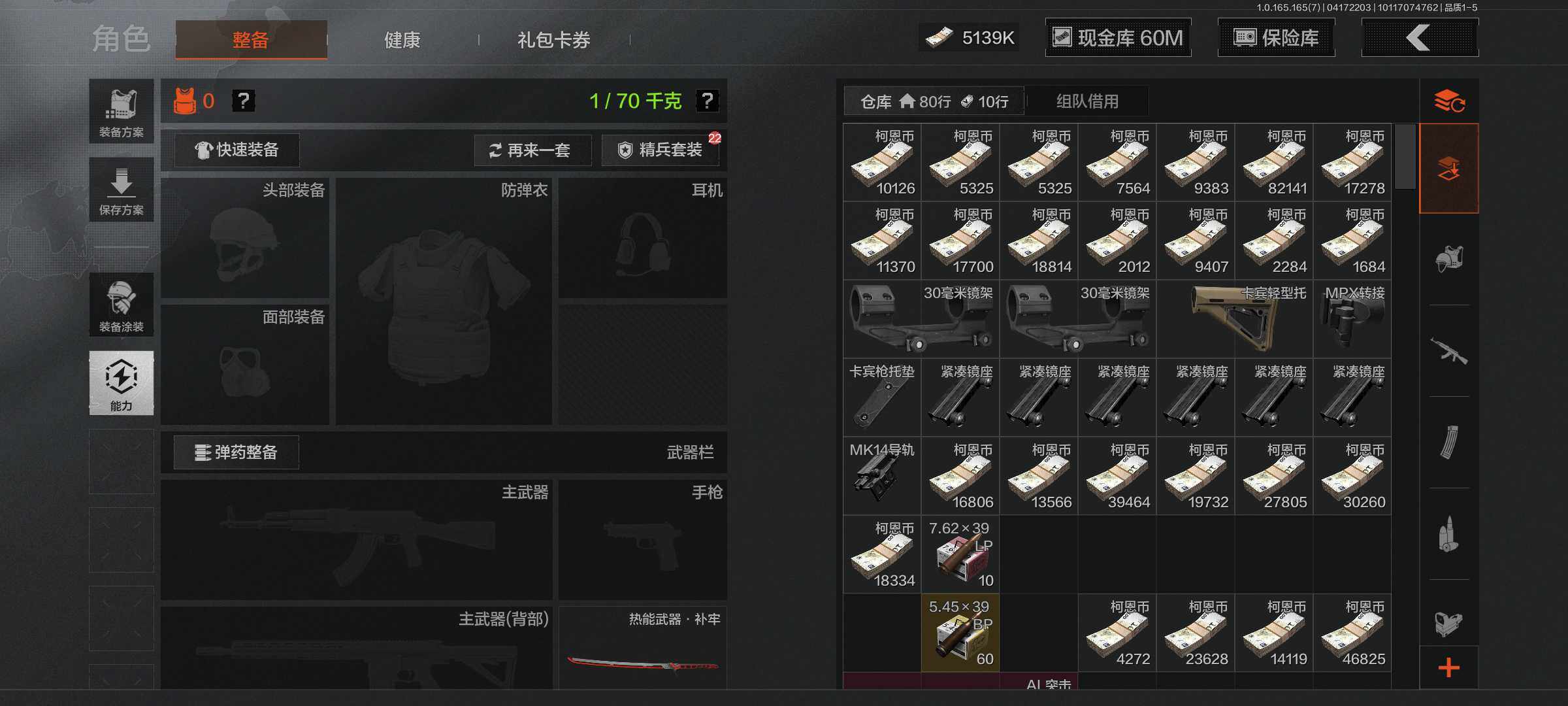 【C2610670173】【AQQQ5】等级:30/段位:新锐/仓库价值(百万):67.5/柯恩币:60000000/热能武器补牢