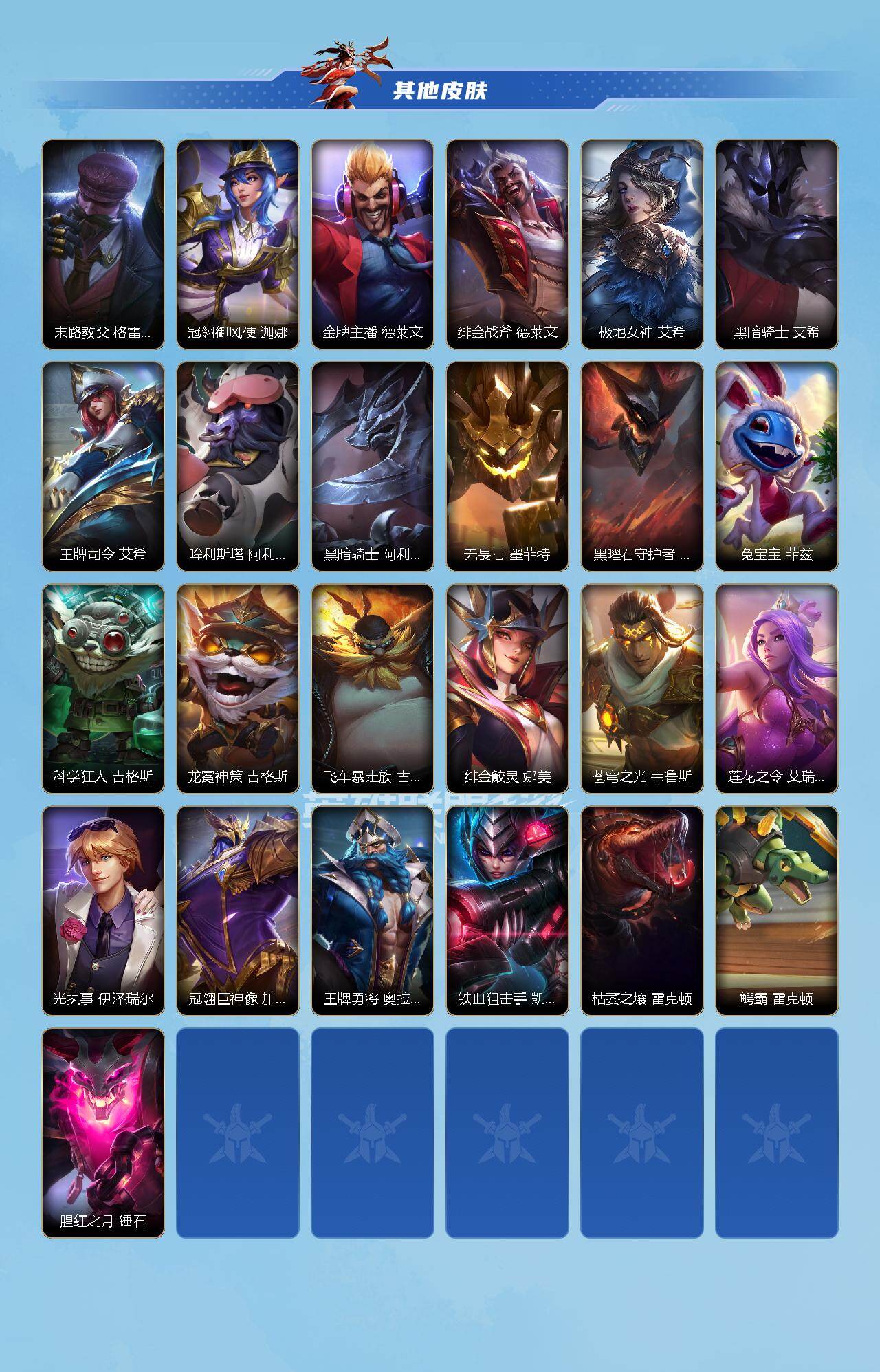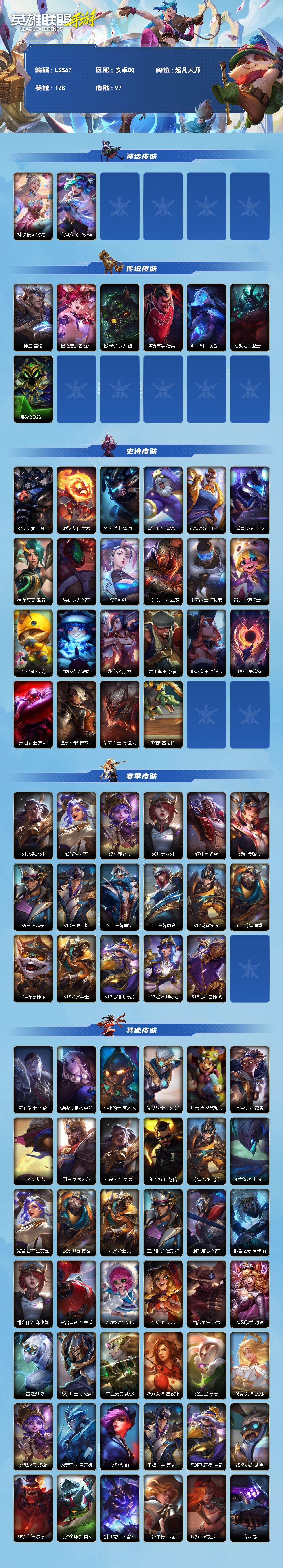 【C2610710112】【LS567】128英雄/97皮肤/超凡大师/桃映暖春 灼灼芳菲 拉克丝/夜星流火 金克丝/神王盖伦/星之守护者 金克丝/欧米伽小队 幽灵特工/灌篮高手/源计划: 联合/地狱之门卫士/最终BOSS维迦/霸天剑魔 亚托克斯/地狱火阿木木/霸天战士狮子狗/雷喵喵尔/礼物选好了吗? 布隆/弹幕天使/神龙尊者玉境灵龙/清剿小队潘森/K/DA ALL OUT阿卡丽/源计划:风/未来战士卢锡安/我,羽饰骑士 崔丝塔娜/小蜜蜂 提莫/寒冬精灵/甜心之羽/地下拳王/魅惑女巫女枪/暗星 墨菲特/天启骑士/西部魔影 持枪女巫 莎弥拉/猎龙勇士奥拉夫/鳄霸 雷克顿/s1光耀之刃/s2光耀之芒/s3光耀之灵/s6绯金丽刃/s7绯金战斧/s8绯金皎灵/s9王牌舰长/s10王牌上将/S11王牌勇将/s11王牌司令/s12龙冕先锋/s13龙冕御盾/s14龙冕神策/s15龙冕异士/s16冠翎飞行员/s17冠翎御风使/S18冠翎巨神像/死亡骑士/游侠法师/小小骑士/光明骑士卡尔玛/脏兮兮/苍穹之光薇恩/时之砂/国王/光耀之刃蛮王/秘密特工/龙冕先锋 赵信/死亡绽放/光耀之芒金克斯/龙冕御盾 布隆/龙冕异士 烬/王牌舰长/钢铁意志/银色之牙/绯金丽刃(可升级)/擂台皇帝/冰霜烈焰/小红帽/西部牛仔亚索/偶像歌手/冲击之刃劫/光明骑士贾克斯/末世天使/烧烤女神/免宝宝提莫/缪斯女神/光耀之灵/冰霜亚龙/女警官/王牌上将 嘉文四世/冠翎飞行员 库奇/超级英雄/战争血统/制胜金球/创世魔神/西部牛仔女枪/抵抗军战姬/暗影/末路教父/冠翎御风使 迦娜/金牌主播/绯金战斧 (可升级)/极地女神/黑暗骑士 艾希/王牌司令 艾希/哞利斯塔/黑暗骑士牛头/无畏号/黑曜石守护者/免宝宝菲兹/科学狂人/龙冕神策 吉格斯/飞车暴走族/绯金鲛灵(可升级)/苍穹之光 韦鲁斯/莲花之令刀妹/光执事EZ/冠翎巨神像 加里奥/王牌勇将 奥拉夫/铁血狙击手/枯萎之壤/鳄霸/腥红之月锤石