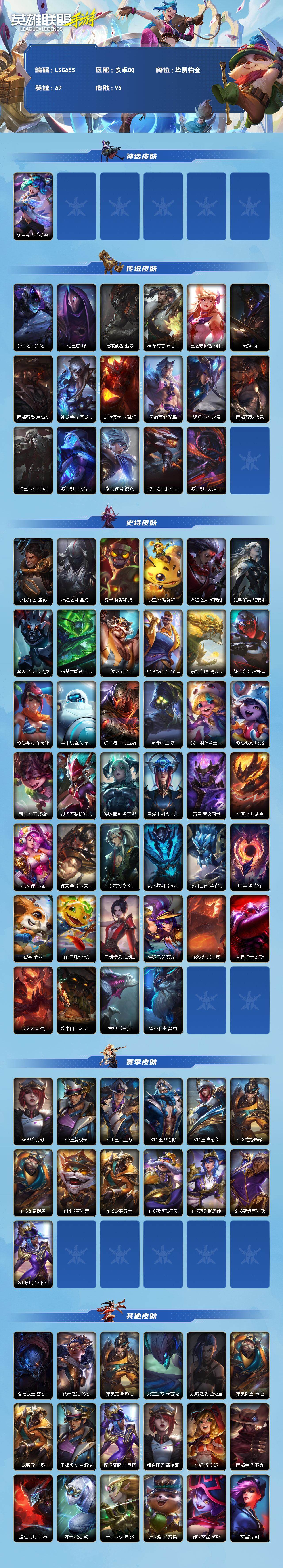 【C2610858689】【LSC655】69英雄/95皮肤/华贵铂金/夜星流火 金克丝/源计划: 净化/暗星尊/黑夜使者亚索/神龙尊者 昼日真龙 亚索/星之守护者阿狸/天煞劫/西部魔影卢锡安/神龙尊者 圣龙 李青/炼狱魔犬/灵魂莲华 瑟提/黎明使者 永恩/西部魔影 永恩/神王诺手/源计划: 联合/黎明使者瑞文/源计划:泯灭 雷克顿/源计划:毁灭 派克/钢铁军团/腥红之月剑魔/丧尸 努努和威朗普/小蜜蜂 努努和威朗普/腥红之月皎月/光明哨兵戴安娜/霸天异形螳螂/猎梦吞噬者 卡兹克/猛虎布隆/礼物选好了吗? 布隆/东恒之曜 奥瑞利安·索尔/源计划: 暗影/泳池派对剑姬/苹果机器人/源计划:风/灵能特工劫/我,羽饰骑士 崔丝塔娜/泳池派对 璐璐/驯龙女巫/银河魔装机神龙女/破败军团龙女/星域审判官/暗星皇子/奈落之炎 凯南/电玩女神女枪/神龙尊者 炎龙 瑟提/心之钢 永恩/灵魂收割者 德莱文/冰川巨兽石头人/暗星 墨菲特/绒毛/柚子软糖 菲兹/玉剑传说 武剑仙/斗魂无双 艾瑞莉娅/地狱火加里奥/天启骑士/奈落之炎/欧米伽小队 天雷爆破手 维迦/古神狼人/雷霆领主 奥恩/s6绯金丽刃/s9王牌舰长/s10王牌上将/S11王牌勇将/s11王牌司令/s12龙冕先锋/s13龙冕御盾/s14龙冕神策/s15龙冕异士/s16冠翎飞行员/s17冠翎御风使/S18冠翎巨神像/S19冠翎征服者/暗黑武土狮子狗/苍穹之光薇恩/龙冕先锋 赵信/死亡绽放/双城之战金克斯/龙冕御盾 布隆/龙冕异士 烬/王牌舰长/冠翎征服者 尼菈/绯金丽刃(可升级)/小红帽/西部牛仔亚索/腥红之月亚索/冲击之刃劫/末世天使/声威黠影 提莫/邪恶女巫/女警官/双城之战蔚/王牌上将 嘉文四世/冠翎飞行员 库奇/超级英雄/创世魔神/热血班长/冠翎御风使 迦娜/黑暗骑士 艾希/王牌司令 艾希/哞利斯塔/免宝宝炸弹人/龙冕神策 吉格斯/飞车暴走族/冠翎巨神像 加里奥/铁哥们儿奥拉夫/王牌勇将 奥拉夫/黑暗骑士布兰德/枯萎之壤