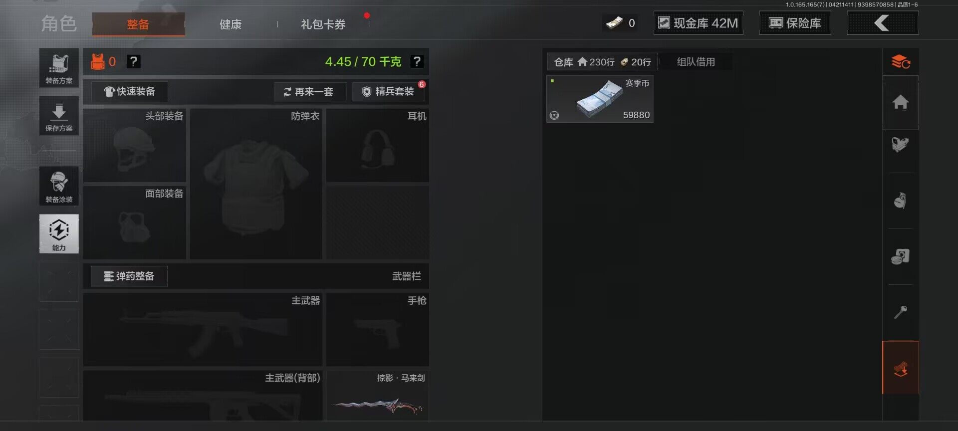 【C2611012870】【AQZG2299】等级:30/段位:王牌/仓库价值(百万):61/柯恩币:42720648/冬日手套/禁忌力量手套/野战折刀/瑞兔折刀/勇士战斧/急袭弯刀/胜利军刀/霜狼生存刀/空腔战术/考古工具撬棍/涂鸦利刃/贝利亚黄昏/赤火炉心/掠影马来剑/深潜行者II/冥河/黑暗行者特摄戏服/伦琴幻影H416/镀火熔金H416/包络战术AKM/战术大师·AK102/告丧夜曲AUG/赤帽要塞AR57/百锻铁骑AEK/战术大师AN94/旧王圣谕QBZ191/浮鳞影青QBZ192/黑金弹头P90/千炼铁阵MK14/银鳞美杜莎/长夜千军武将/天工炉火A545