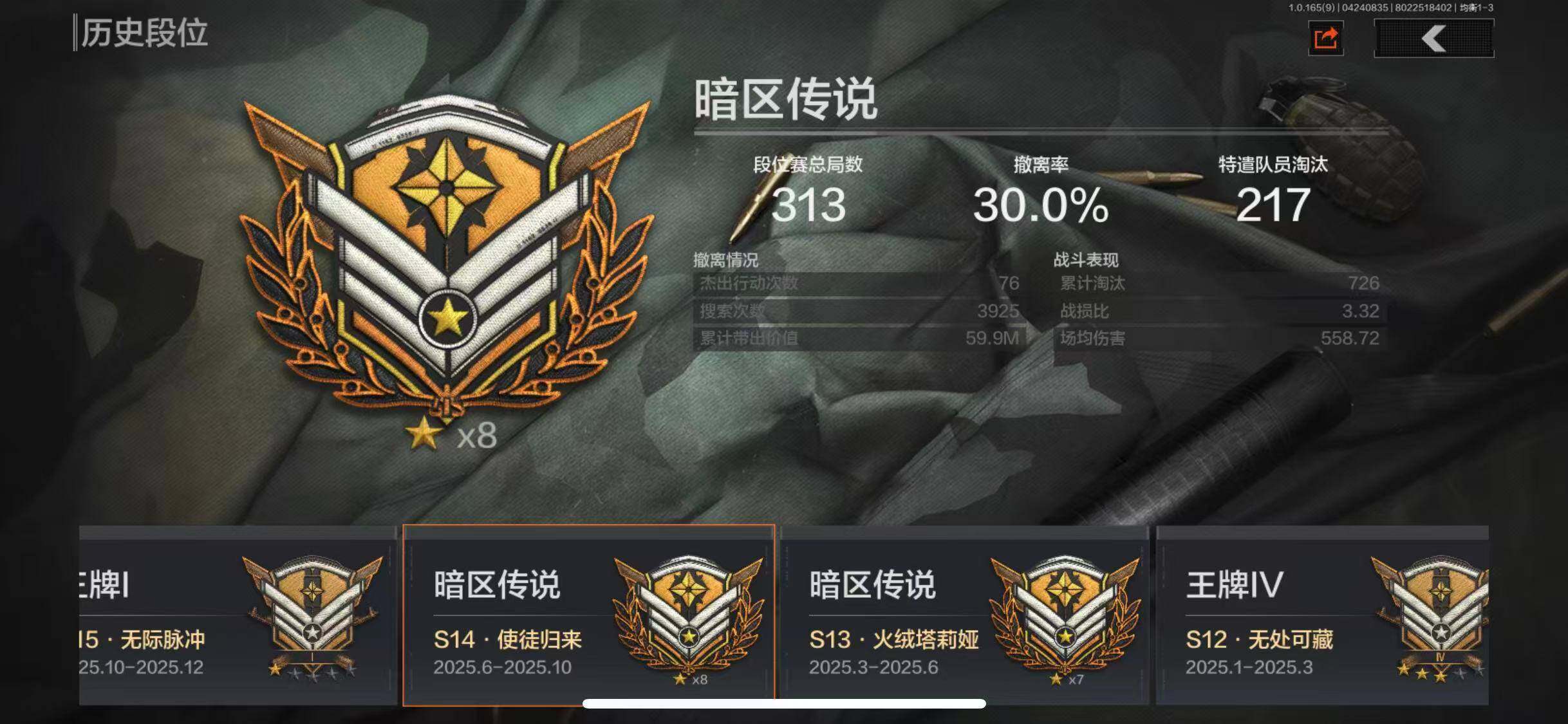 【C2611393831】【AQN277】等级:30/段位:暗区传说/仓库价值(百万):19/柯恩币:1493/空腔战术/百炼恒常/深潜行者II