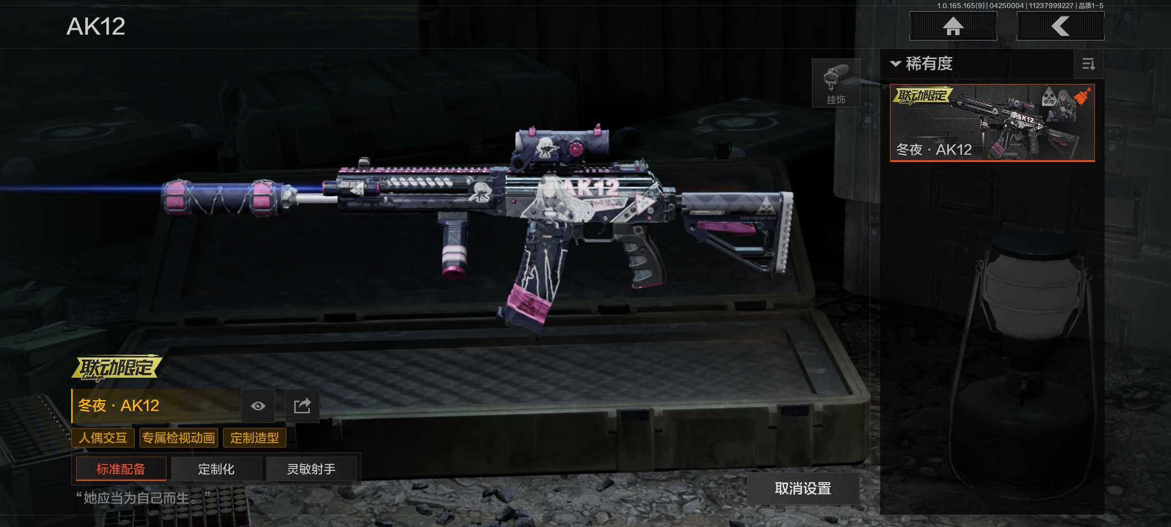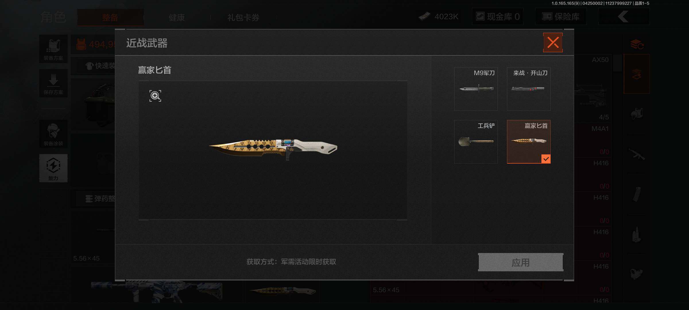 【C2611404501】【AQQQ14】等级:30/段位:专家/仓库价值(百万):35.5/赢家匕首/工兵铲/蓝色咆哮H416/冬夜AK12/旧王圣谕QBZ191/浮鳞影青QBZ192/旧王圣谕VSS/棱光裂变QBU191