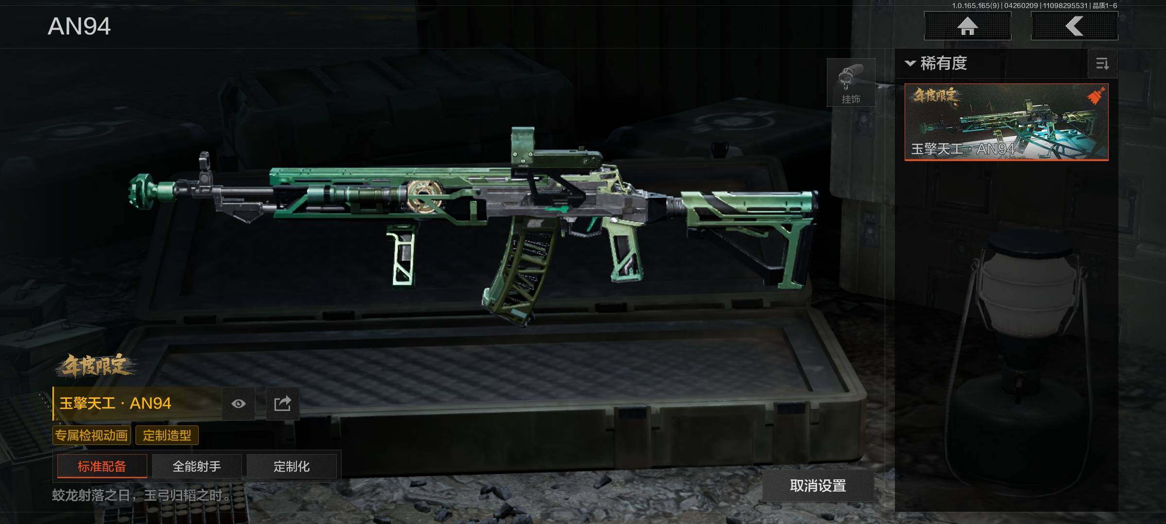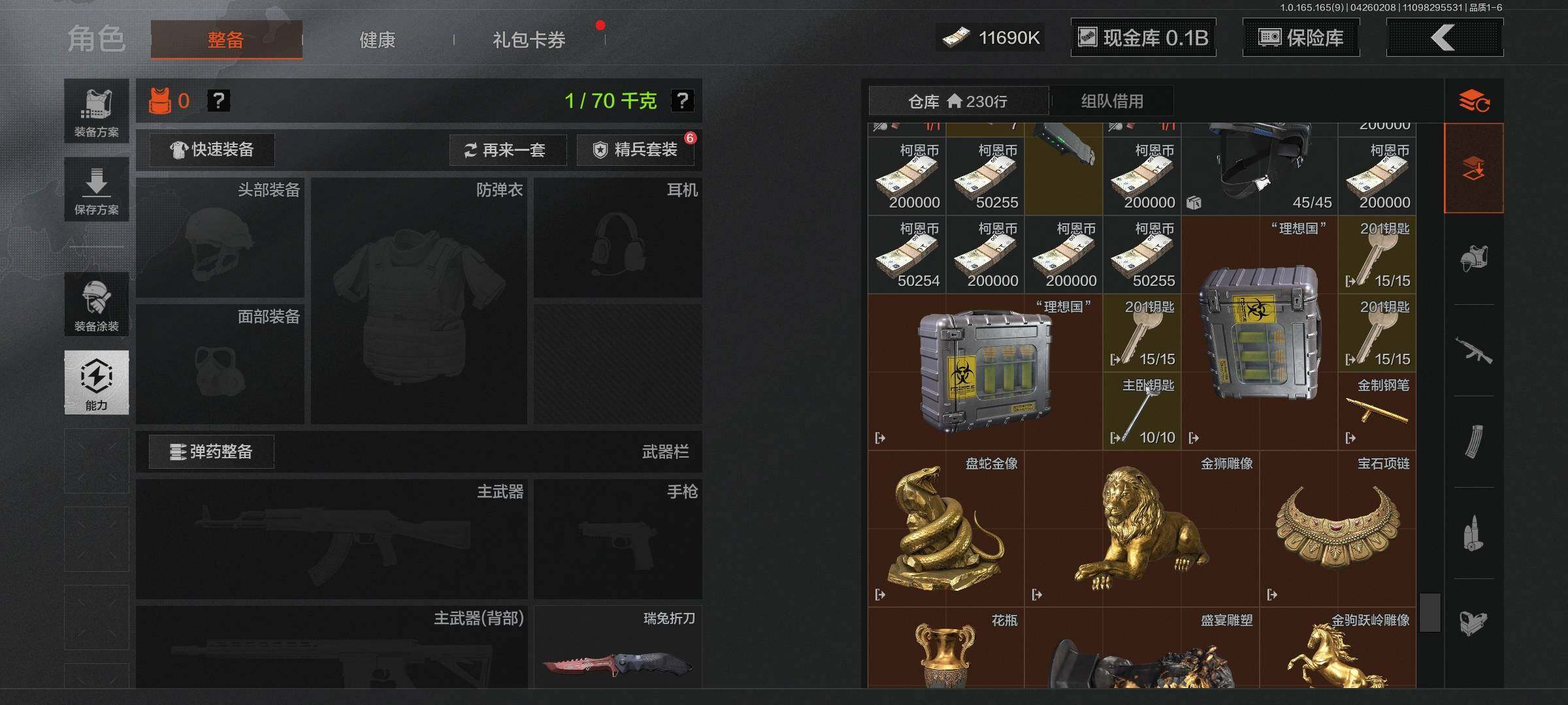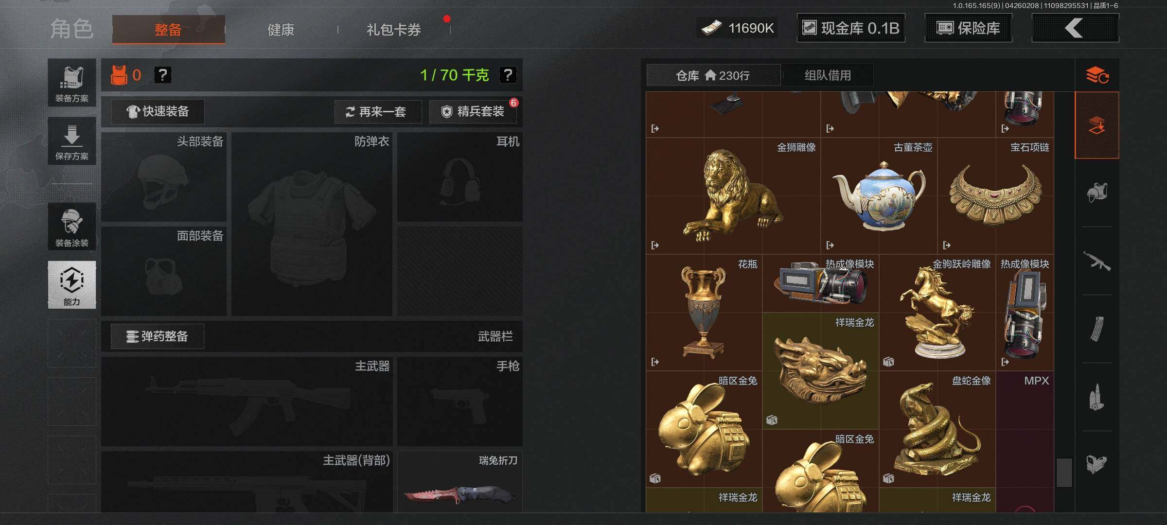 【C2611573943】【AQZG2386】等级:30/段位:专家/仓库价值(百万):193/柯恩币:109000000/瑞兔折刀/赤火炉心/工兵铲/蝮蛇/白蔷薇斯黛拉/冥河/苍白隐者伪装服/深潜行者II/多斯地下法则/竞技风潮M4A1/林中人·FAL/百锻铁骑AEK/玉擎天工AN94/玉擎天工MP5/骑士之剑VSS/千炼铁阵MK14/清影/太玄/长夜千军武将/冲刺极限QBZ192