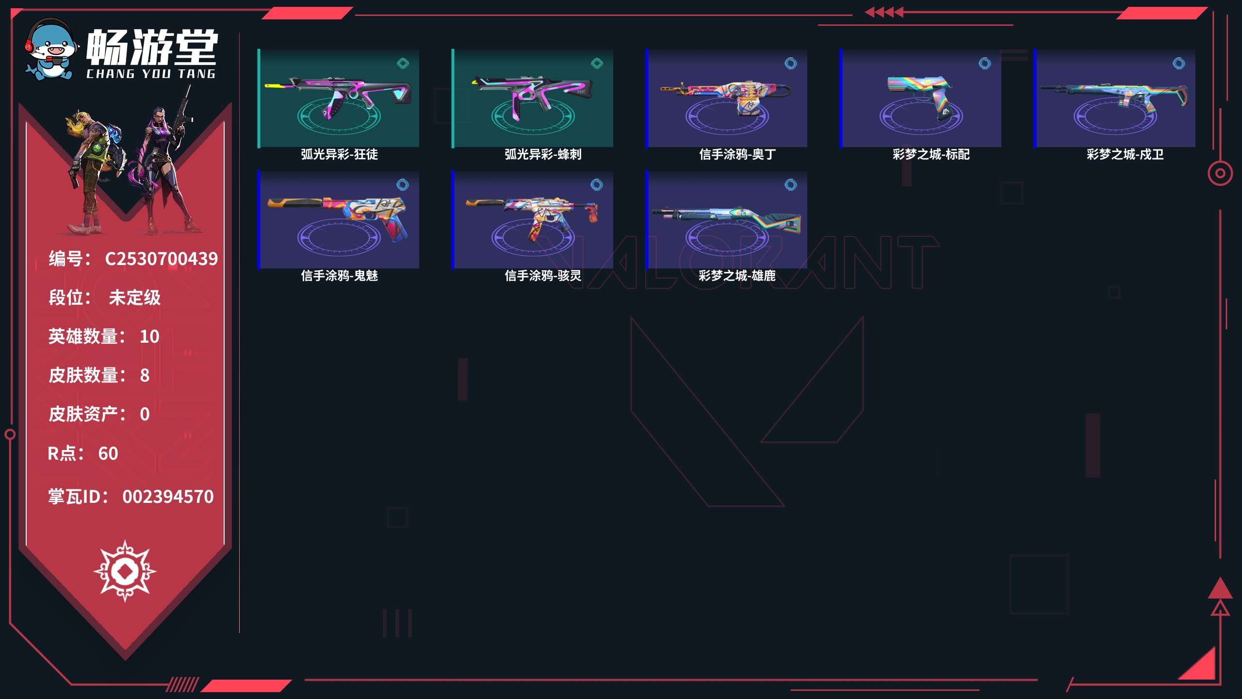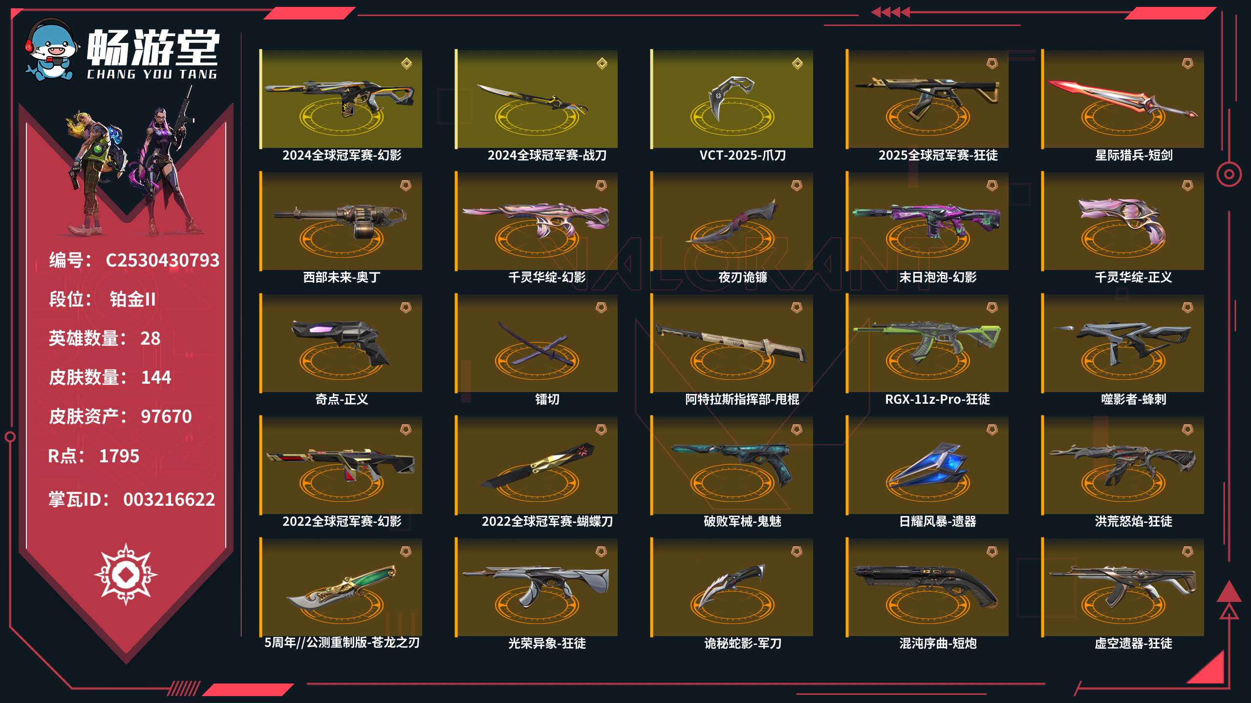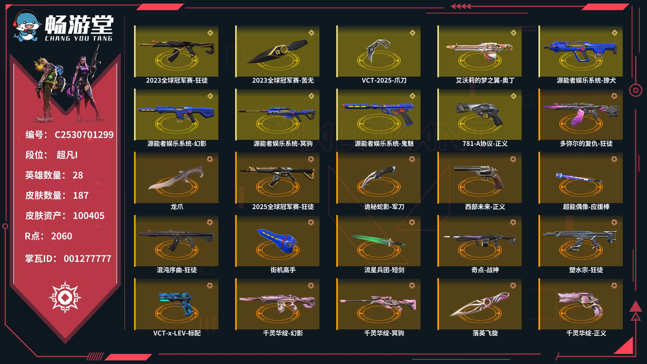 【C2530701299】皮肤资产:100405 皮肤数量:187 英雄数量:28 R点:2060 段位: 超凡I 2023全球冠军赛-狂徒 2023全球冠军赛-苦无 VCT-2025-爪刀 套装 【VCT 2025 赛季 礼包(VCT-2025-爪刀)】  【源能者娱乐系统(源能者娱乐系统-幻影,源能者娱乐系统-冥驹,源能者娱乐系统-鬼魅,源能者娱乐系统-獠犬,街机高手)】  【千灵华绽(千灵华绽-幻影,千灵华绽-正义,千灵华绽-判官,千灵华绽-冥驹,落英飞旋)】  【堕天遗武(堕天遗武-狂徒,堕天遗武-冥驹,堕天遗武-骇灵,堕天遗武-标配,堕天遗武-仪式匕首)】  【天界神兵(天界神兵-蜂刺,天界神兵-戍卫,天界神兵-飞将,天界神兵-鬼魅,天玄刀)】  【归零者(归零者-短炮,归零者-狂徒,归零者-冥驹,归零者-獠犬,生物收割器)】  【盖亚的复仇(盖亚的复仇-鬼魅,盖亚的复仇-戍卫,盖亚的复仇-狂徒,盖亚的复仇-飞将,盖亚之怒)】  【2023全球冠军赛(2023全球冠军赛-狂徒,2023全球冠军赛-苦无)】  【无畏启程(超能冲撞-标配)】 狂徒【幻心猎手-狂徒,多弥尔的复仇-狂徒,瑰梦艺语-狂徒,2025全球冠军赛-狂徒,诡秘蛇影-狂徒,混沌序曲-狂徒,超能偶像-狂徒,流星兵团-狂徒,塑水宗-狂徒,海洋之星-狂徒,钢轨卫士-狂徒,沙尘幻旅-狂徒,弧光异彩-狂徒,紫阙金琅-狂徒】幻影【星际猎兵-幻影,末日之翼-幻影,聚合之力-幻影,般若假面-幻影,珍珠棘贝-幻影,战术小伙伴-幻影,噬源兽防卫工程-幻影,侦察力量-幻影,合金战车-幻影】近战武器【龙爪,诡秘蛇影-军刀,超能偶像-应援棒,流星兵团-短剑,珍珠棘贝-短剑,钢轨卫士-战锤,沙尘幻旅-匕首,剥皮小刀,盖亚之愠,弧光异彩-军刀,合金战车-军刀】正义【诛心猎手-正义,西部未来-正义,掠影-正义,781-A协议-正义,纤云弄巧-正义,奇点-正义,复古浪潮-正义,机动狂飙-正义,沙尘幻旅-正义,合金战车-正义】冥驹【掠影-冥驹,模拟赫兹-冥驹,复古浪潮-冥驹,胡桃狂想-冥驹,偃月苍龙-冥驹,花漾粉红-冥驹】鬼魅【瑰梦艺语-鬼魅,诡秘蛇影-鬼魅,模拟赫兹-鬼魅,采蜜小蜂队-鬼魅,流星兵团-鬼魅,光导纤维-鬼魅,胡桃狂想-鬼魅,信手涂鸦-鬼魅,数码咒术-鬼魅】骇灵【瑰梦艺语-骇灵,浮光跃金-骇灵,流星兵团-骇灵,珍珠棘贝-骇灵,光导纤维-骇灵,沙尘幻旅-骇灵,信手涂鸦-骇灵,花漾粉红-骇灵】标配【折光棱晶-标配,浮光跃金-标配,超能偶像-标配,VCT-x-LEV-标配,战术熊与伙伴们-标配,VCT-x-PRX-标配,光导纤维-标配,彩梦之城-标配】短炮【甜心猎手-短炮,末日之翼-短炮,纤云弄巧-短炮,深海水族-短炮,钢轨卫士-短炮,弧光异彩-短炮】狂怒【光环序列-狂怒,聚合之力-狂怒,战术熊与伙伴们-狂怒,珍珠棘贝-狂怒,钢轨卫士-狂怒,萌彩剪影-狂怒,花漾粉红-狂怒】蜂刺【甜心猎手-蜂刺,折光棱晶-蜂刺,超限闪存-蜂刺,聚合之力-蜂刺,纤云弄巧-蜂刺,深海水族-蜂刺,战术小伙伴-蜂刺,胡桃狂想-蜂刺,弧光异彩-蜂刺,合金战车-蜂刺】雄鹿【瑰梦艺语-雄鹿,模拟赫兹-雄鹿,离子武器-雄鹿,复古浪潮-雄鹿,彩梦之城-雄鹿】判官【星际猎兵-判官,诡秘蛇影-判官,采蜜小蜂队-判官,超能偶像-判官,萌彩剪影-判官,数码咒术-判官】獠犬【诛心猎手-獠犬,采蜜小蜂队-獠犬,复古浪潮-獠犬,战术小伙伴-獠犬,胡桃狂想-獠犬,弧光异彩-獠犬,数码咒术-獠犬】戍卫【甜心猎手-戍卫,光环序列-戍卫,折光棱晶-戍卫,浮光跃金-戍卫,超能偶像-戍卫,战术熊与伙伴们-戍卫,珍珠棘贝-戍卫,钢轨卫士-戍卫,萌彩剪影-戍卫,彩梦之城-戍卫,花漾粉红-戍卫】飞将【星际猎兵-飞将,末日之翼-飞将,聚合之力-飞将,战术熊与伙伴们-飞将,光导纤维-飞将,沙尘幻旅-飞将,信手涂鸦-飞将,合金战车-飞将】战神【光环序列-战神,浮光跃金-战神,采蜜小蜂队-战神,奇点-战神,深海水族-战神,萌彩剪影-战神,数码咒术-战神】奥丁【诛心猎手-奥丁,末日之翼-奥丁,艾沃莉的梦之翼-奥丁,流星兵团-奥丁,战术小伙伴-奥丁,信手涂鸦-奥丁】莽侠【甜心猎手-莽侠,诡秘蛇影-莽侠,超限闪存-莽侠,纤云弄巧-莽侠,深海水族-莽侠】