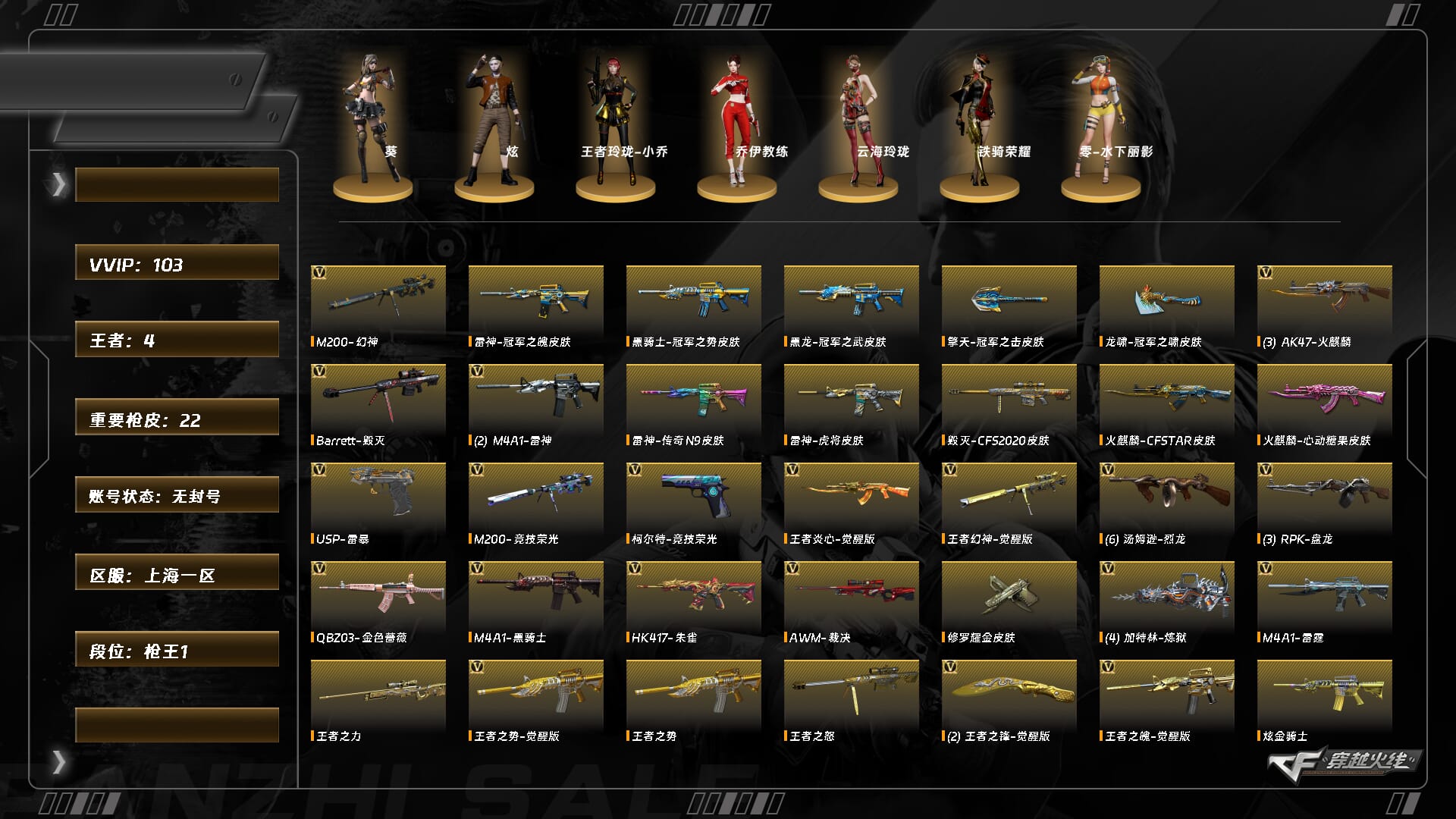 【C2534621083】[14520139]ABC10871/东部/上海一区/钱包无法注销/可排位/可二次/掌火ID:471809934/103V/幻神/王者幻神/M200竞技荣光套/M200竞技荣光/裁决/6烈龙/炼狱迷你小钢/雷霆套/COP雷霆/USP雷暴/朱雀/QBZ金色蔷薇/天龙/毁灭/极光/黑骑士/雷神/火麒麟/黑龙/【小人枪】/裁决雪莉杨/【四防已开】/王者玲珑小乔/【角色】/葵/炫/乔伊教练/云海玲珑/【音效卡】/黑龙音效卡/黑骑士音效卡/【皮肤】/黑龙冠军之武/毁灭CFS2018/黑骑士冠军之势/雷神N9/毁灭CFS2020/火麒麟CFS2018/永久AC/细节看图