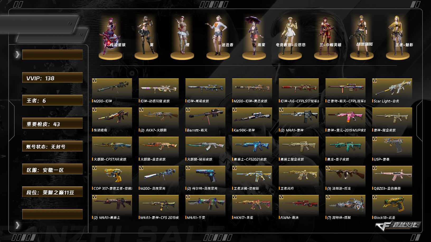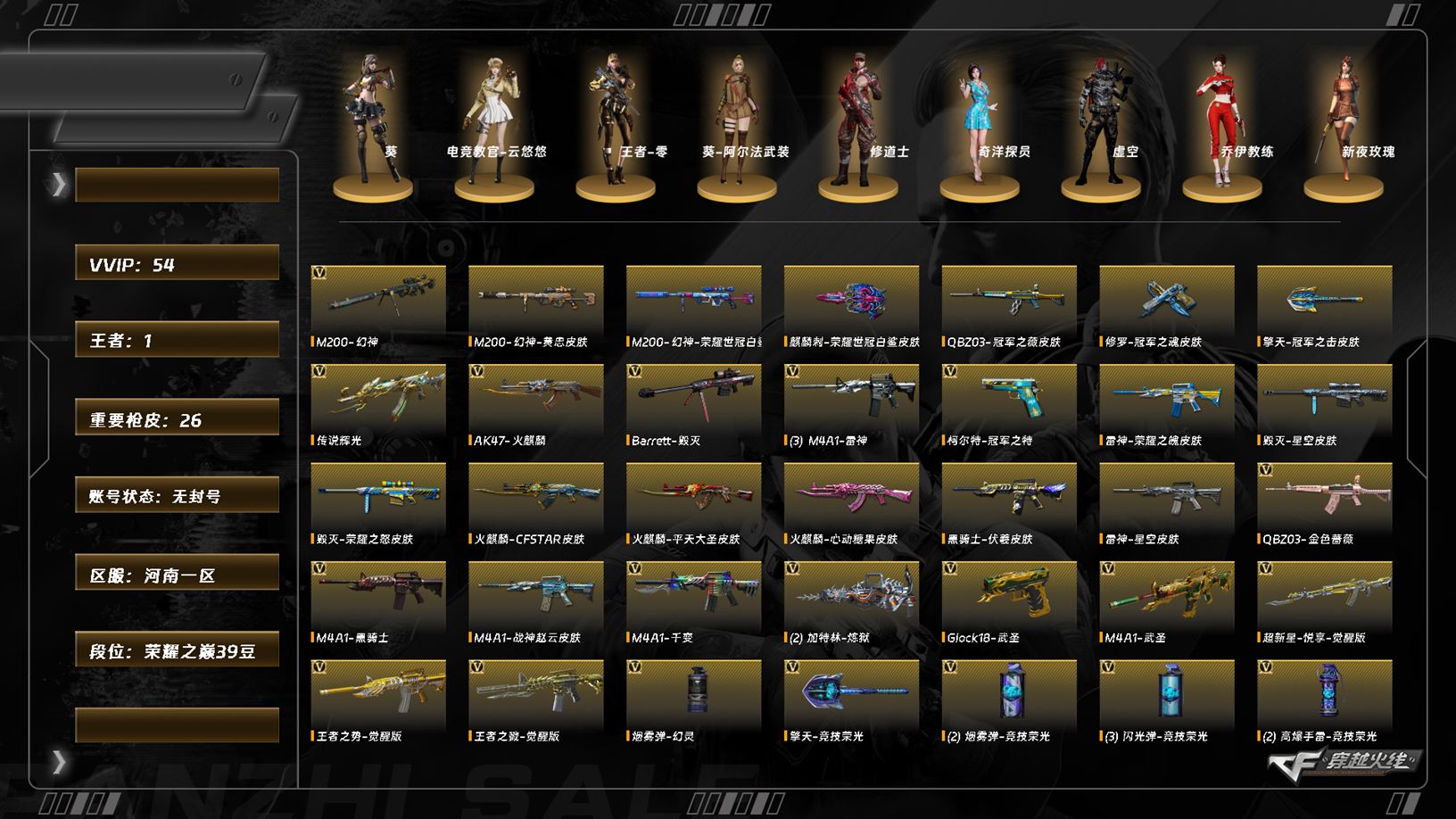 【C2535876439】[13814196]XH9124/南部/广东一区//可排位/Lv.100大元帅/24V/【未觉醒】王者风神/M200竞技荣光/星神/金色蔷薇古蛇迷踪/柯尔特无冕之王/超新星/火麒麟/无影神兵利器/【角色】/隼/战地猎狐/乔伊教练/电竞少女/代号翼【玩偶武器】/朱雀蛇隐宗/迷你白狐///各种道具、饰品/细节看图/【此账号未被封过十年】