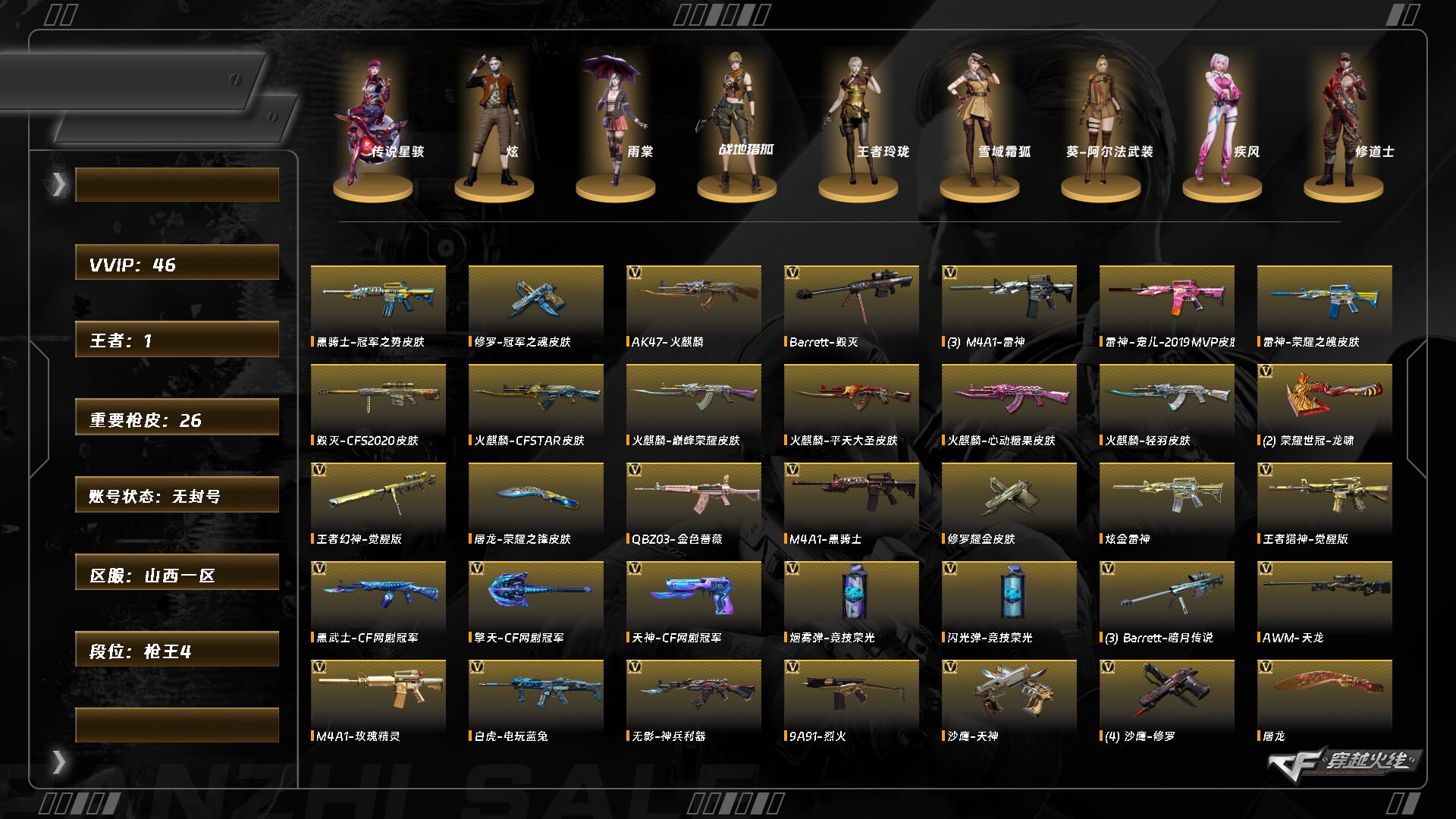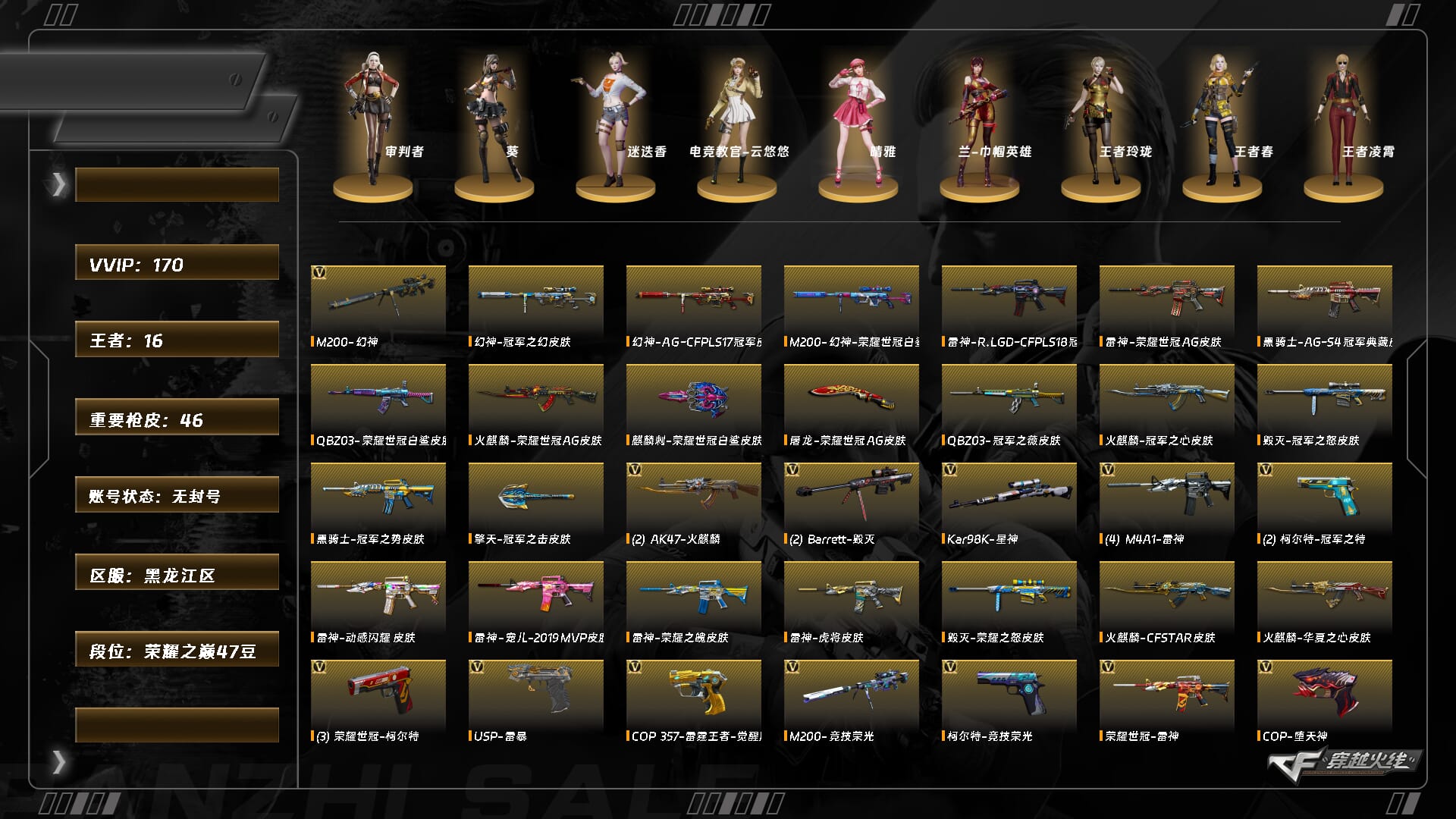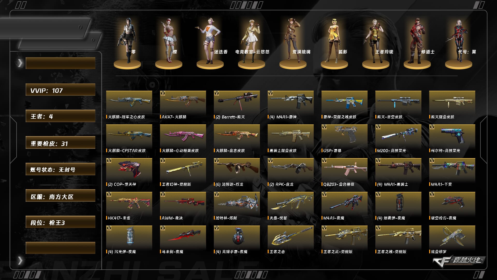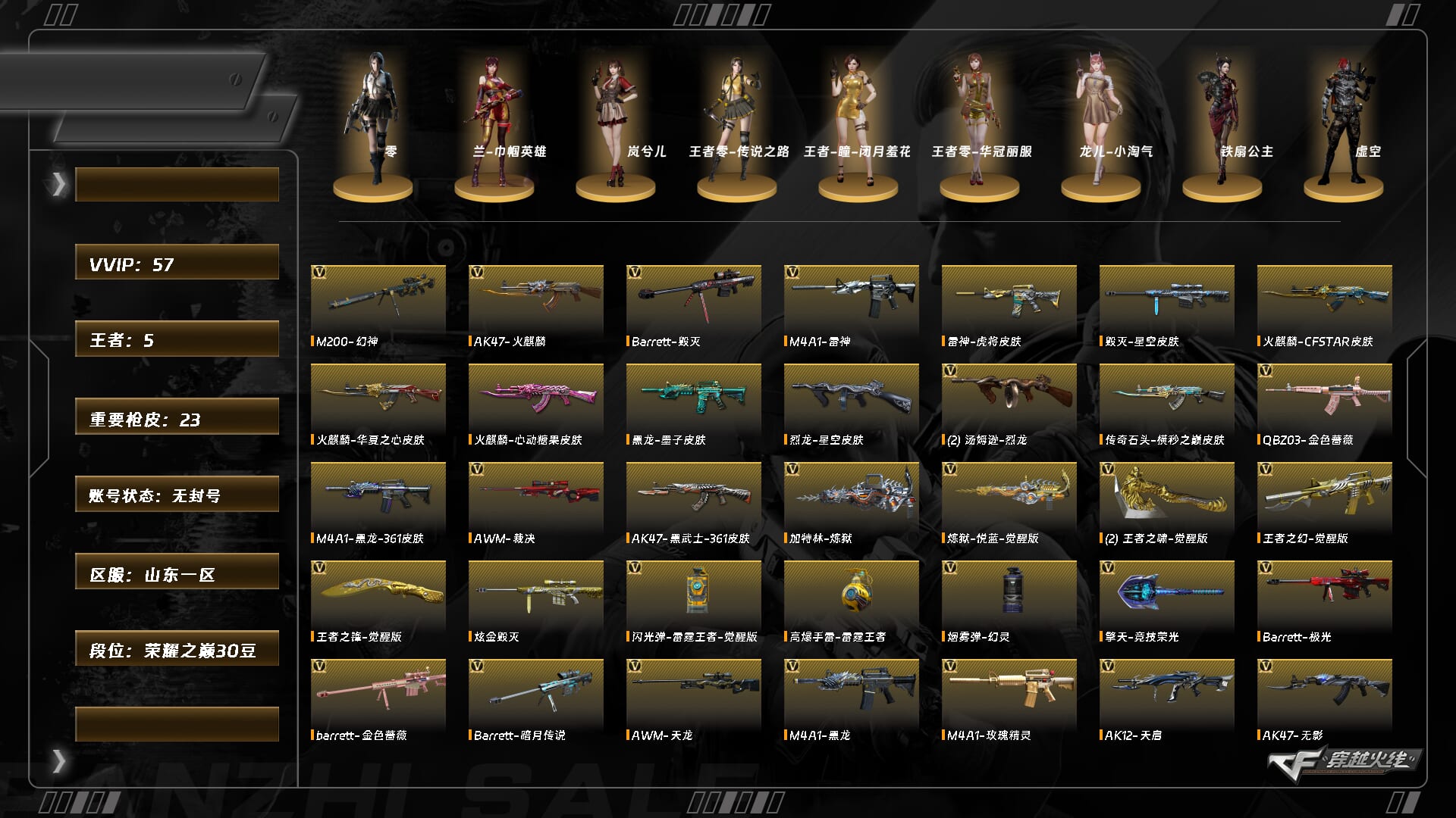 【C26064340】[15122169]XH9475/北部/山东一区/可排位/【荣耀之巅30豆】【Lv.100 高阶大元帅】VIP6/55V/幻神/QBZ金色蔷薇/朱雀电竞之星/3烈龙/2炼狱/烈火动感闪耀套/巴雷特金色蔷薇/裁决/毁灭/极光/修罗/王者之锋/王者之啸/【皮肤音效卡】/毁灭英雄计划/毁灭墨兰/传奇石头横秒之巅/黑龙墨子/黑龙361/毁灭音效卡/【1个四防角色】/兰巾帼英雄/【其他角色】/岚兮儿/王者瞳闭月羞花/王者零华冠丽服/【玩偶武器】/金色蔷薇空/迷你深渊冰龙/夺魂/迷你宝贝///各种道具、饰品/细节看图/【账号封禁过十年已解】/