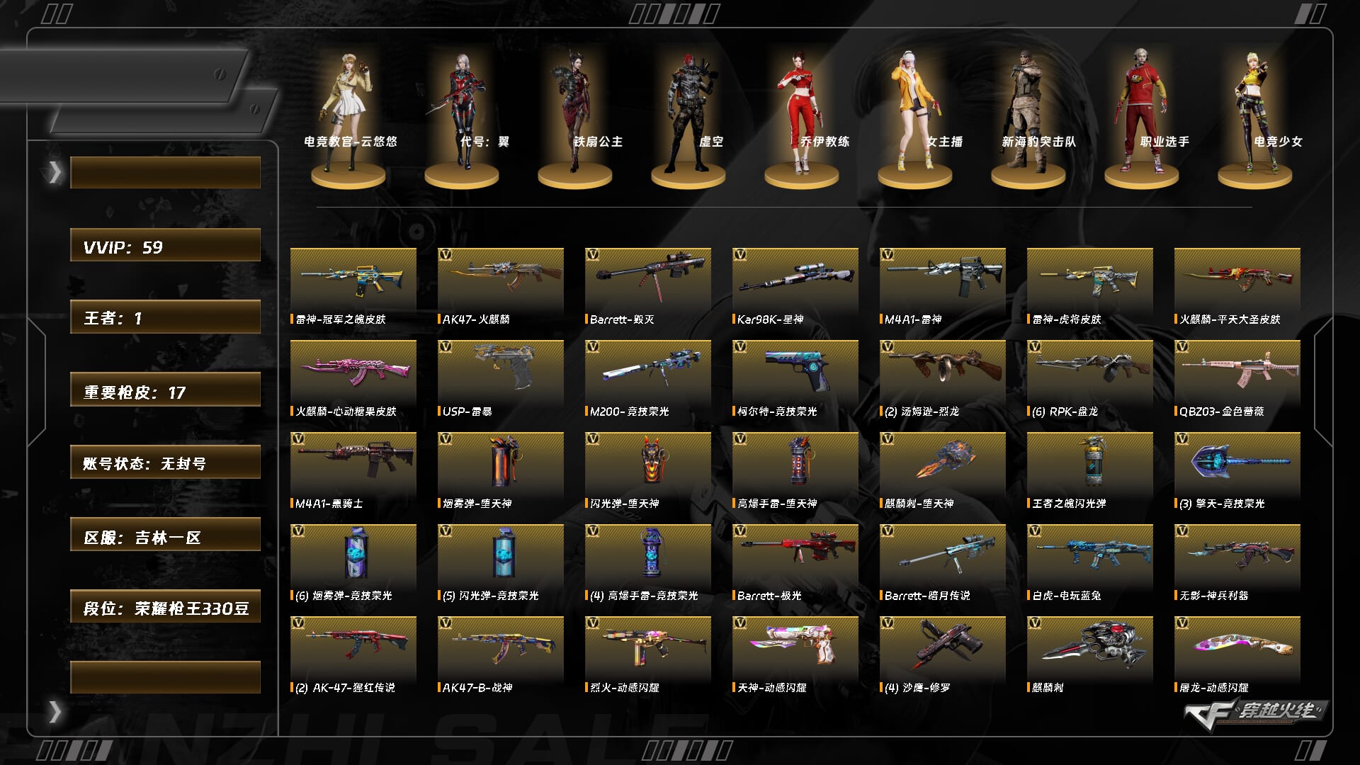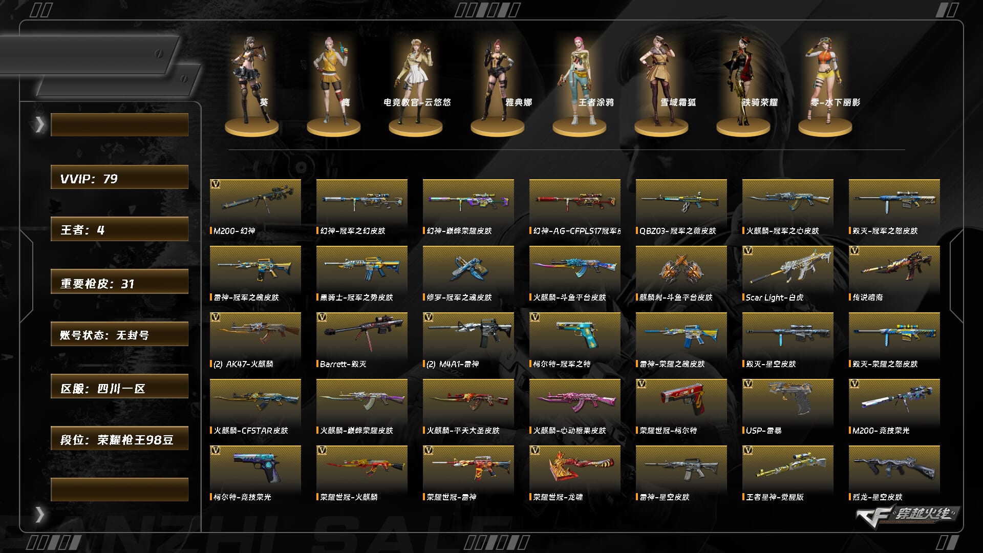 【C26120084】[15161675]XH9485/西部/四川一区/可排位/【荣耀枪王98豆】【Lv.102 荣耀元帅】/78V/传说暗裔/【幻神4皮】/幻神/冠军之幻/幻神荣耀世冠EP/幻神巅峰荣耀/幻神AG冠军/王者星神/M200竞技荣光套/【QBZ三件套】/QBZ金色蔷薇/QBZ金色蔷薇音效卡/QBZ冠军之薇/白虎/白虎白鲨CFPLS23冠军/玄武/柯尔特冠军之特/柯尔特荣耀世冠EP/荣耀世冠柯尔特/USP雷暴/柯尔特竞技荣光/4修罗/冠军之刃/【皮肤音效卡】/毁灭冠军之怒/毁灭荣耀之怒/火麒麟巅峰荣耀/火麒麟斗鱼/雷神冠军之魄/雷神荣耀之魄/黑骑士冠军之势/修罗冠军之魂/屠龙荣耀之锋/毁灭音效卡/雷神音效卡/黑骑士音效卡/死神雪域霜狐怀旧音效卡/【角色】/电竞教官云悠悠/鹰/王者涂鸦/葵/雅典娜/雪域霜狐/零水下丽影///各种道具、饰品/细节看图/【账号封禁过十年已解】/