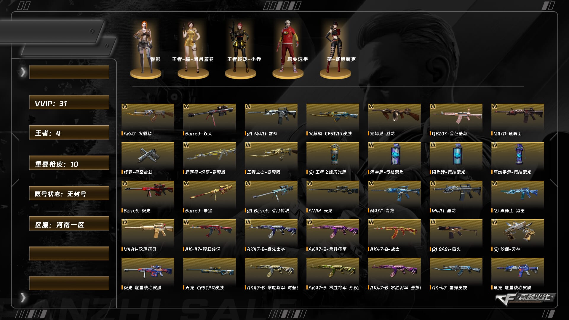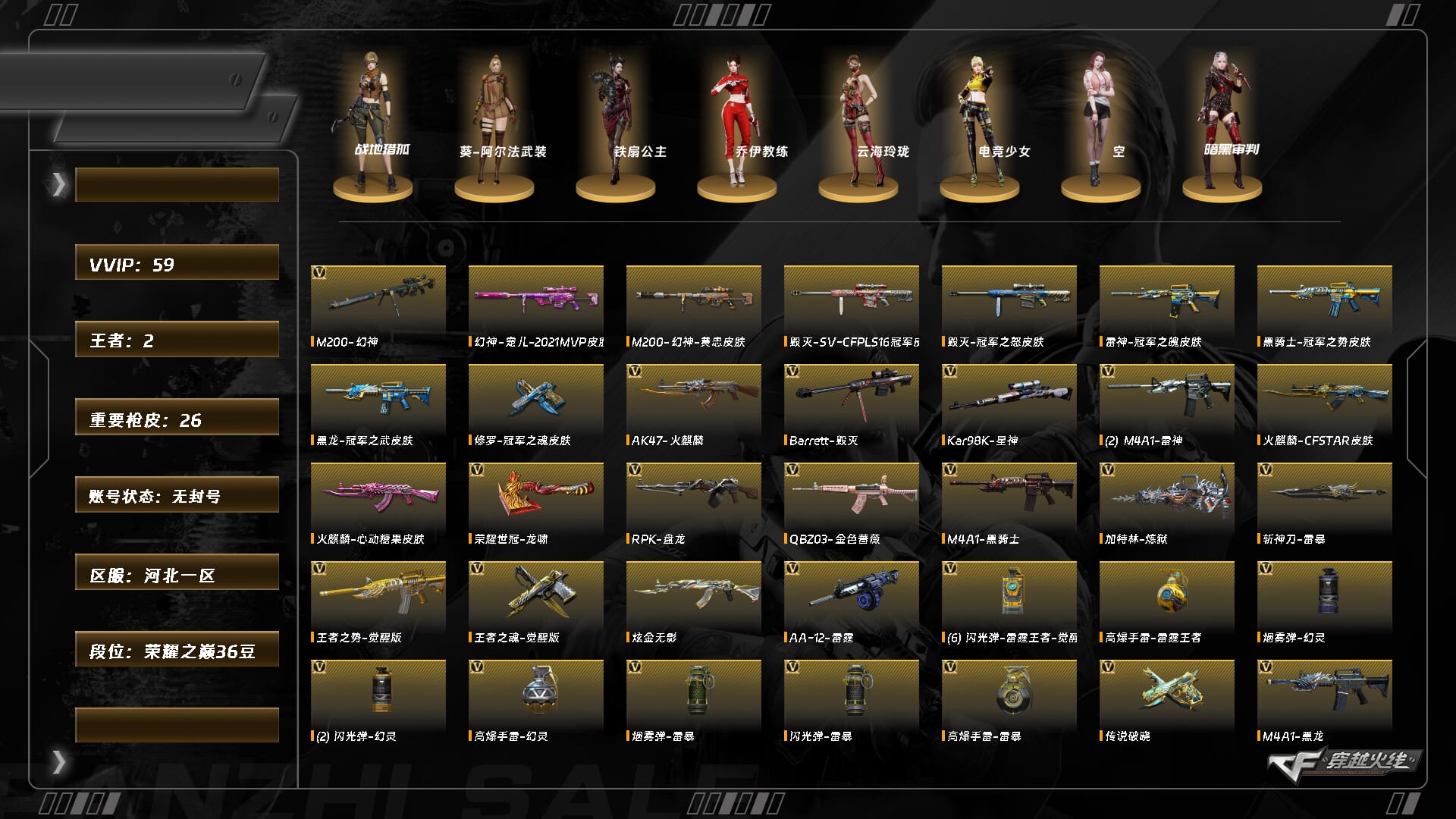 【C261085870】[15483815]ABC11099/南部/广西一区/钱包注销/可排位/可二次/掌火ID:770256006/134V/双/幻神/玄豹/裁决/6烈龙/4炼狱/朱雀/QBZ金色蔷薇/天龙/毁灭/极光/黑骑士/雷神/火麒麟/麒麟/黑龙/【角色】/零纪元/战地猎狐/乔伊教练/王者零/新海豹突击队/云海玲珑/【音效卡】/黑骑士音效卡/雷神音效卡/毁灭音效卡/永久AC/细节看图