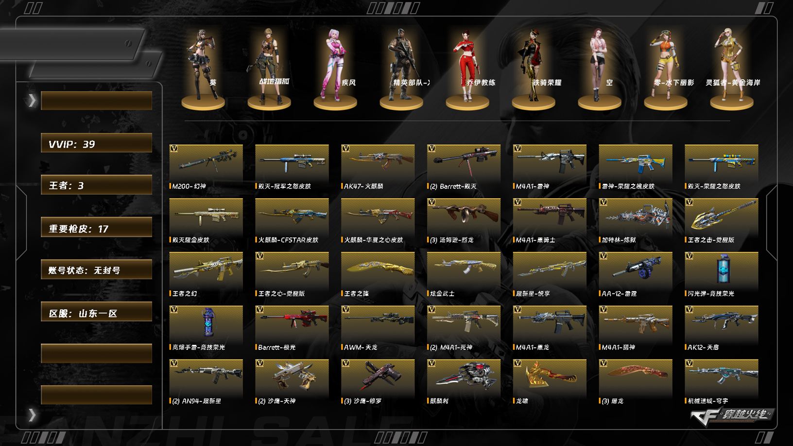 【C263163126】[16289270]LC8165/北部/山东一区/可排位/37v/幻神/火麒麟/黑龙/雷神/黑骑士/死神/天启/超新星/机械迷城穹宇/天龙/毁灭/极光/【角色】/葵/零纪元/战地猎狐/幻面灵狐/乔伊教练/【音效卡/火麒麟音效卡/毁灭音效卡/屠龙电竞之星竞星跃动音效卡/雷神音效卡/】/【枪皮】/炼狱迷彩/裁决羽掣/雷神宇航兔/王者武器/王者之心/王者之幻/王者之锋/王者之击/炫金武器/炫金武士/【小人枪/雷神精英刀锋/火麒麟零纪元/KAC锯式机枪黑桃战神/巴雷特赏金猎人/】/永久AC/找回包赔