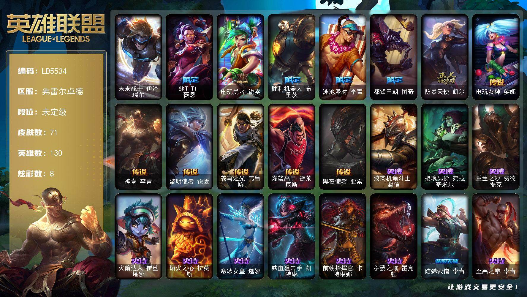 【C2535954342】[14932717]LM422/暗影岛/ 单双排段位:英勇黄铜 英雄数量:171 皮肤数量:107 炫彩数量:12 臻彩数量:2 神话数量:2 云顶神话数量:0 游戏点卷:50 神话精粹:75 蓝色精萃:21584 橙色精粹:5944 钥匙:6 宝箱:10 【重要头像】 【重要皮肤】银龙裁决泰隆 圣诞糖果棒厄运小姐 FPX李青 SSW泰隆 暗杀星蒙多 Fnatic库奇 冰雪节格雷福斯 冰雪节玛尔扎哈 防暴天使凯尔 冠军之刃锐雯 圣诞狂欢基兰 圣诞狂欢努努和威朗普 喜庆之树茂凯 邪恶圣诞老人维迦 暗影沃里克 诺斯费拉图弗拉基米尔 阿木木主人不要我了 都铎王朝图奇 十周年纪念安妮 源代码乐芙兰 【传说皮肤】黯黑魔龙希瓦娜 宇航员诺提勒斯 女皇艾希 第三类接触黑默丁格 霸天异形卡兹克 灌篮高手德莱厄斯 红色男爵库奇 【重要炫彩】霸天战士雷恩加尔星啸天火 魔女阿卡丽虚荣