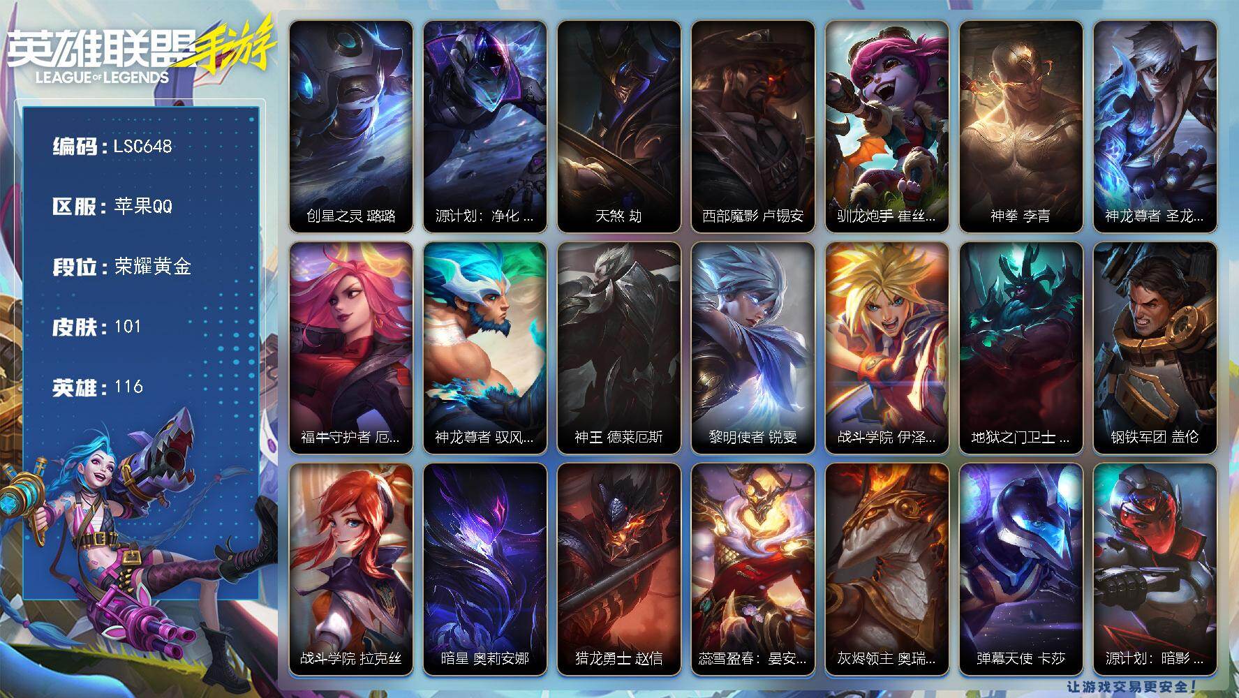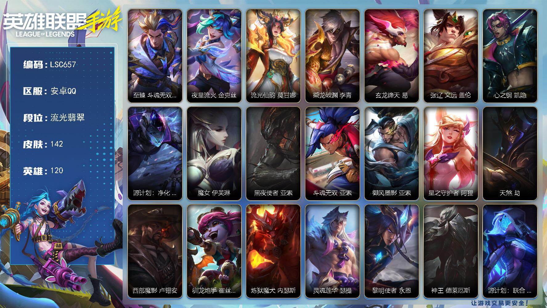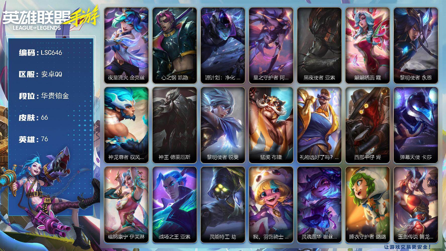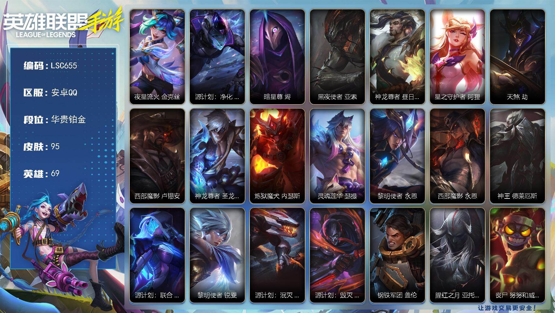 【C2610858689】【LSC655】69英雄/95皮肤/华贵铂金/夜星流火 金克丝/源计划: 净化/暗星尊/黑夜使者亚索/神龙尊者 昼日真龙 亚索/星之守护者阿狸/天煞劫/西部魔影卢锡安/神龙尊者 圣龙 李青/炼狱魔犬/灵魂莲华 瑟提/黎明使者 永恩/西部魔影 永恩/神王诺手/源计划: 联合/黎明使者瑞文/源计划:泯灭 雷克顿/源计划:毁灭 派克/钢铁军团/腥红之月剑魔/丧尸 努努和威朗普/小蜜蜂 努努和威朗普/腥红之月皎月/光明哨兵戴安娜/霸天异形螳螂/猎梦吞噬者 卡兹克/猛虎布隆/礼物选好了吗? 布隆/东恒之曜 奥瑞利安·索尔/源计划: 暗影/泳池派对剑姬/苹果机器人/源计划:风/灵能特工劫/我,羽饰骑士 崔丝塔娜/泳池派对 璐璐/驯龙女巫/银河魔装机神龙女/破败军团龙女/星域审判官/暗星皇子/奈落之炎 凯南/电玩女神女枪/神龙尊者 炎龙 瑟提/心之钢 永恩/灵魂收割者 德莱文/冰川巨兽石头人/暗星 墨菲特/绒毛/柚子软糖 菲兹/玉剑传说 武剑仙/斗魂无双 艾瑞莉娅/地狱火加里奥/天启骑士/奈落之炎/欧米伽小队 天雷爆破手 维迦/古神狼人/雷霆领主 奥恩/s6绯金丽刃/s9王牌舰长/s10王牌上将/S11王牌勇将/s11王牌司令/s12龙冕先锋/s13龙冕御盾/s14龙冕神策/s15龙冕异士/s16冠翎飞行员/s17冠翎御风使/S18冠翎巨神像/S19冠翎征服者/暗黑武土狮子狗/苍穹之光薇恩/龙冕先锋 赵信/死亡绽放/双城之战金克斯/龙冕御盾 布隆/龙冕异士 烬/王牌舰长/冠翎征服者 尼菈/绯金丽刃(可升级)/小红帽/西部牛仔亚索/腥红之月亚索/冲击之刃劫/末世天使/声威黠影 提莫/邪恶女巫/女警官/双城之战蔚/王牌上将 嘉文四世/冠翎飞行员 库奇/超级英雄/创世魔神/热血班长/冠翎御风使 迦娜/黑暗骑士 艾希/王牌司令 艾希/哞利斯塔/免宝宝炸弹人/龙冕神策 吉格斯/飞车暴走族/冠翎巨神像 加里奥/铁哥们儿奥拉夫/王牌勇将 奥拉夫/黑暗骑士布兰德/枯萎之壤