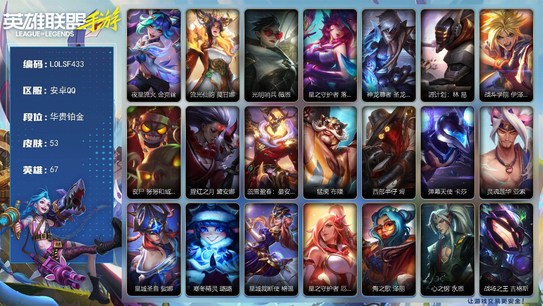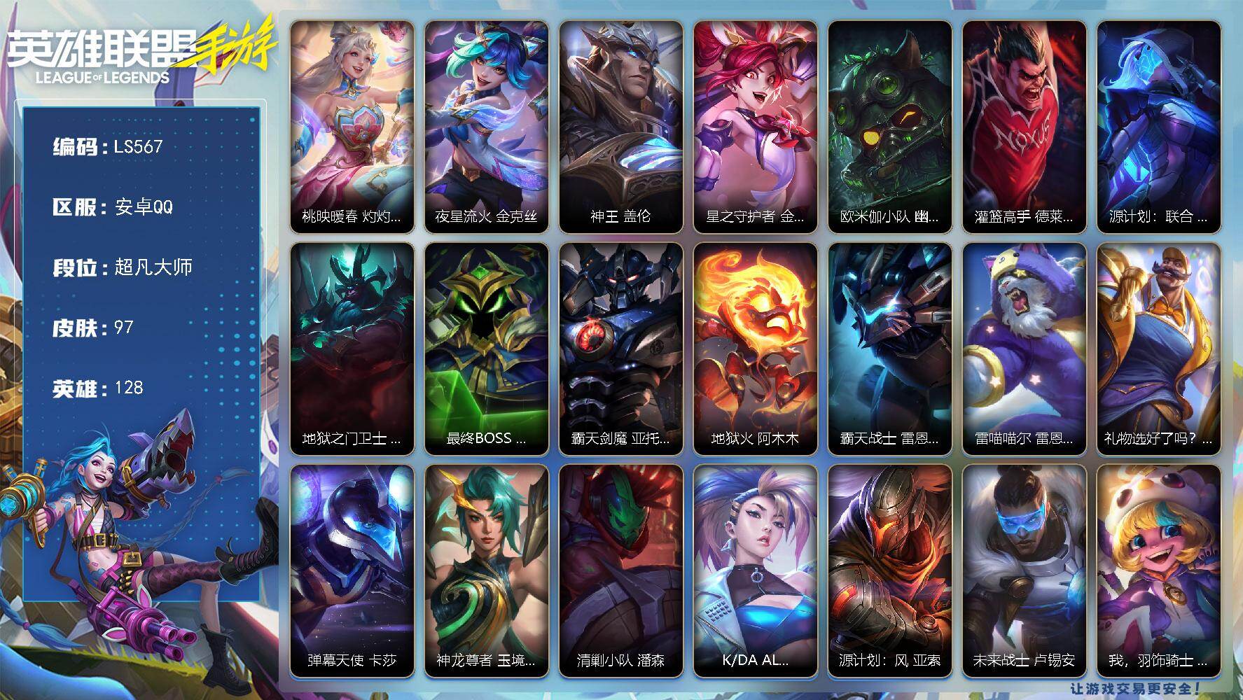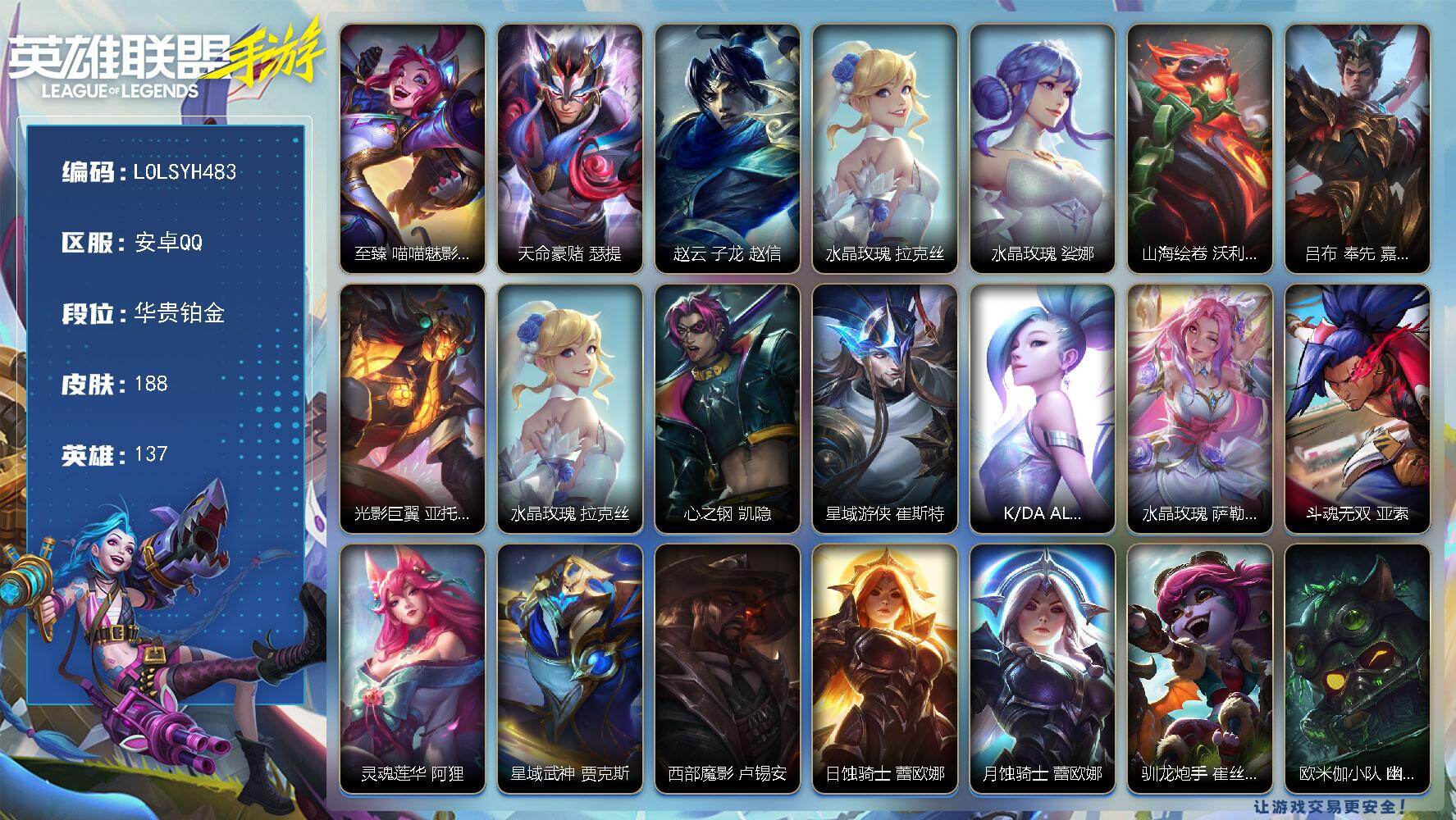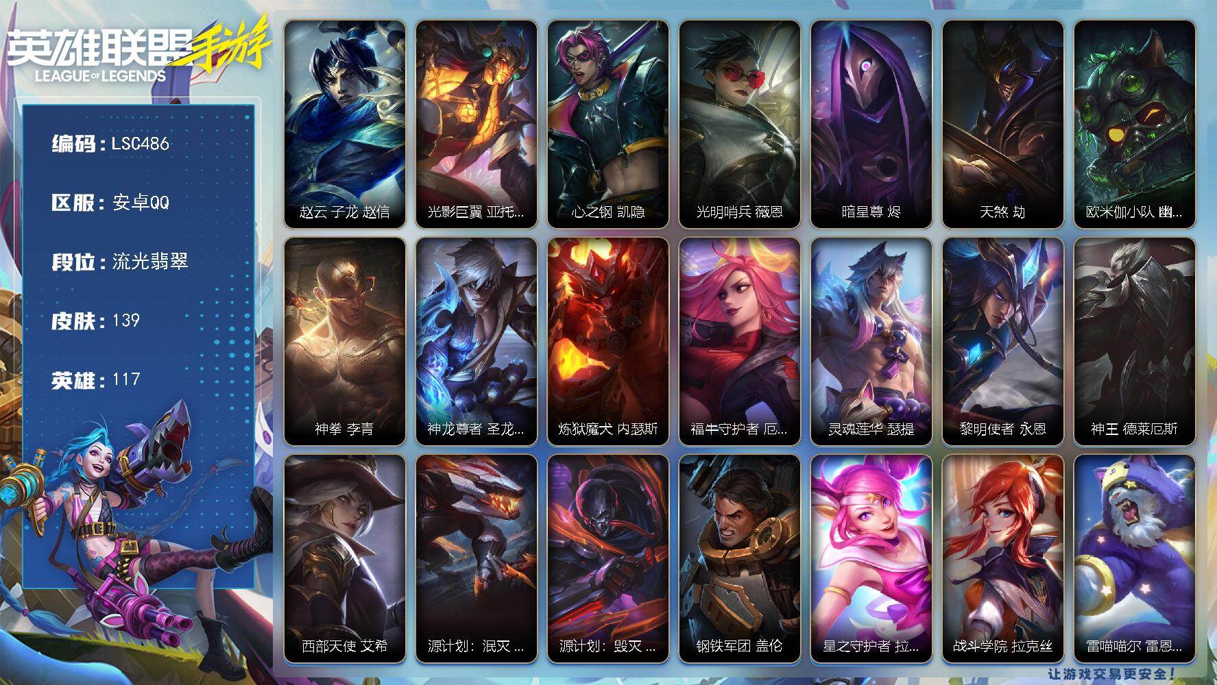 【C2610858689】【LSC655】69英雄/95皮肤/华贵铂金/夜星流火 金克丝/源计划: 净化/暗星尊/黑夜使者亚索/神龙尊者 昼日真龙 亚索/星之守护者阿狸/天煞劫/西部魔影卢锡安/神龙尊者 圣龙 李青/炼狱魔犬/灵魂莲华 瑟提/黎明使者 永恩/西部魔影 永恩/神王诺手/源计划: 联合/黎明使者瑞文/源计划:泯灭 雷克顿/源计划:毁灭 派克/钢铁军团/腥红之月剑魔/丧尸 努努和威朗普/小蜜蜂 努努和威朗普/腥红之月皎月/光明哨兵戴安娜/霸天异形螳螂/猎梦吞噬者 卡兹克/猛虎布隆/礼物选好了吗? 布隆/东恒之曜 奥瑞利安·索尔/源计划: 暗影/泳池派对剑姬/苹果机器人/源计划:风/灵能特工劫/我,羽饰骑士 崔丝塔娜/泳池派对 璐璐/驯龙女巫/银河魔装机神龙女/破败军团龙女/星域审判官/暗星皇子/奈落之炎 凯南/电玩女神女枪/神龙尊者 炎龙 瑟提/心之钢 永恩/灵魂收割者 德莱文/冰川巨兽石头人/暗星 墨菲特/绒毛/柚子软糖 菲兹/玉剑传说 武剑仙/斗魂无双 艾瑞莉娅/地狱火加里奥/天启骑士/奈落之炎/欧米伽小队 天雷爆破手 维迦/古神狼人/雷霆领主 奥恩/s6绯金丽刃/s9王牌舰长/s10王牌上将/S11王牌勇将/s11王牌司令/s12龙冕先锋/s13龙冕御盾/s14龙冕神策/s15龙冕异士/s16冠翎飞行员/s17冠翎御风使/S18冠翎巨神像/S19冠翎征服者/暗黑武土狮子狗/苍穹之光薇恩/龙冕先锋 赵信/死亡绽放/双城之战金克斯/龙冕御盾 布隆/龙冕异士 烬/王牌舰长/冠翎征服者 尼菈/绯金丽刃(可升级)/小红帽/西部牛仔亚索/腥红之月亚索/冲击之刃劫/末世天使/声威黠影 提莫/邪恶女巫/女警官/双城之战蔚/王牌上将 嘉文四世/冠翎飞行员 库奇/超级英雄/创世魔神/热血班长/冠翎御风使 迦娜/黑暗骑士 艾希/王牌司令 艾希/哞利斯塔/免宝宝炸弹人/龙冕神策 吉格斯/飞车暴走族/冠翎巨神像 加里奥/铁哥们儿奥拉夫/王牌勇将 奥拉夫/黑暗骑士布兰德/枯萎之壤