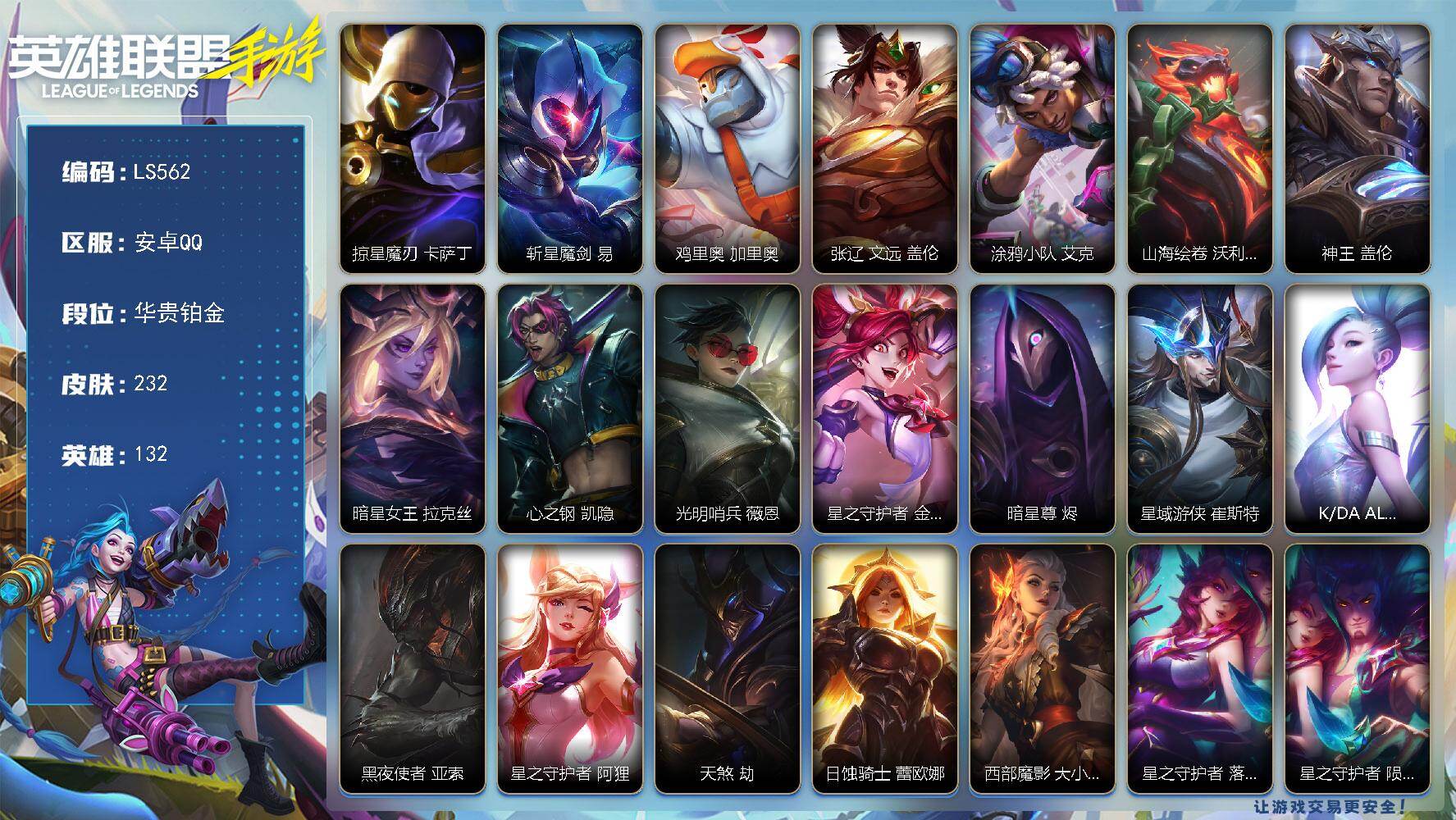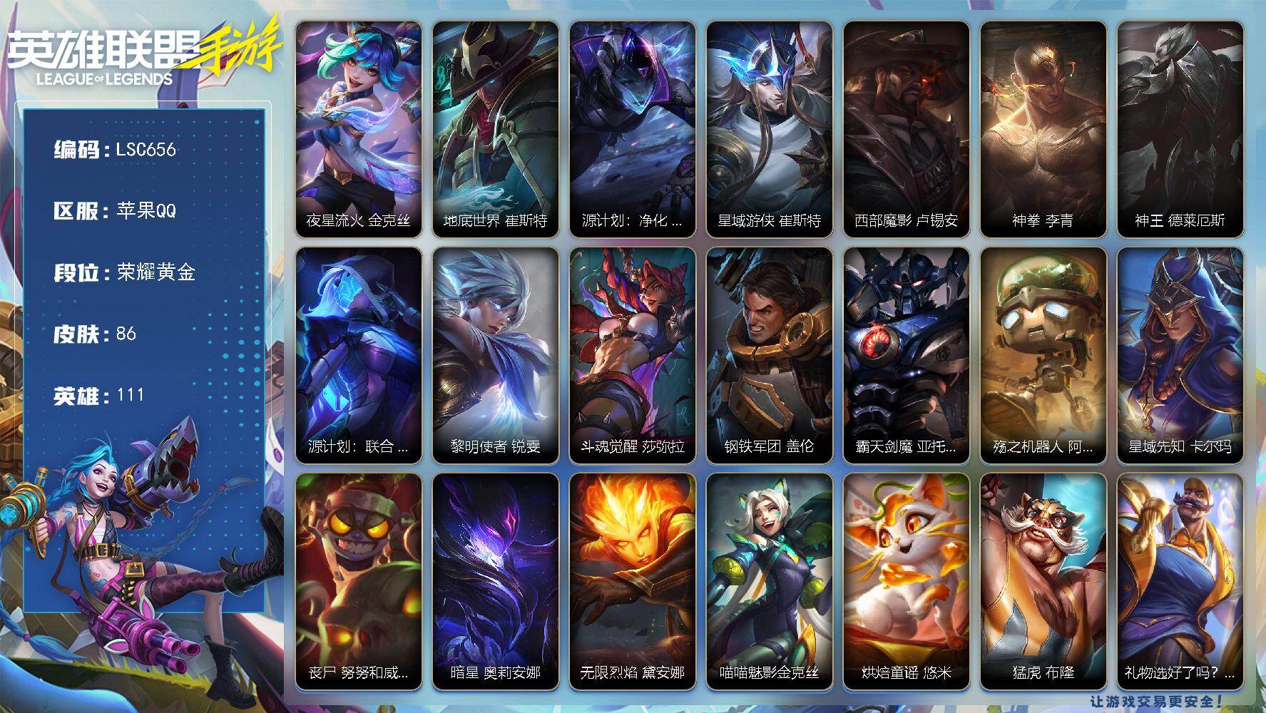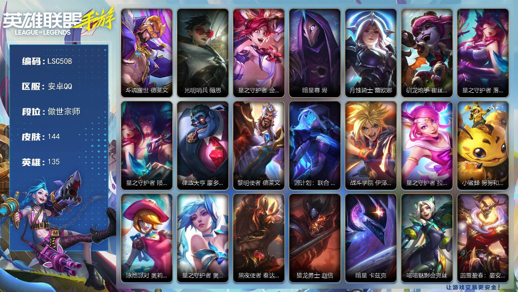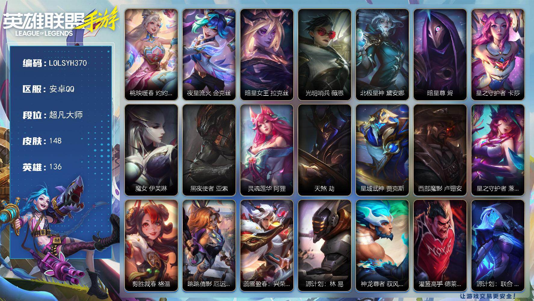 【C2610858689】【LSC655】69英雄/95皮肤/华贵铂金/夜星流火 金克丝/源计划: 净化/暗星尊/黑夜使者亚索/神龙尊者 昼日真龙 亚索/星之守护者阿狸/天煞劫/西部魔影卢锡安/神龙尊者 圣龙 李青/炼狱魔犬/灵魂莲华 瑟提/黎明使者 永恩/西部魔影 永恩/神王诺手/源计划: 联合/黎明使者瑞文/源计划:泯灭 雷克顿/源计划:毁灭 派克/钢铁军团/腥红之月剑魔/丧尸 努努和威朗普/小蜜蜂 努努和威朗普/腥红之月皎月/光明哨兵戴安娜/霸天异形螳螂/猎梦吞噬者 卡兹克/猛虎布隆/礼物选好了吗? 布隆/东恒之曜 奥瑞利安·索尔/源计划: 暗影/泳池派对剑姬/苹果机器人/源计划:风/灵能特工劫/我,羽饰骑士 崔丝塔娜/泳池派对 璐璐/驯龙女巫/银河魔装机神龙女/破败军团龙女/星域审判官/暗星皇子/奈落之炎 凯南/电玩女神女枪/神龙尊者 炎龙 瑟提/心之钢 永恩/灵魂收割者 德莱文/冰川巨兽石头人/暗星 墨菲特/绒毛/柚子软糖 菲兹/玉剑传说 武剑仙/斗魂无双 艾瑞莉娅/地狱火加里奥/天启骑士/奈落之炎/欧米伽小队 天雷爆破手 维迦/古神狼人/雷霆领主 奥恩/s6绯金丽刃/s9王牌舰长/s10王牌上将/S11王牌勇将/s11王牌司令/s12龙冕先锋/s13龙冕御盾/s14龙冕神策/s15龙冕异士/s16冠翎飞行员/s17冠翎御风使/S18冠翎巨神像/S19冠翎征服者/暗黑武土狮子狗/苍穹之光薇恩/龙冕先锋 赵信/死亡绽放/双城之战金克斯/龙冕御盾 布隆/龙冕异士 烬/王牌舰长/冠翎征服者 尼菈/绯金丽刃(可升级)/小红帽/西部牛仔亚索/腥红之月亚索/冲击之刃劫/末世天使/声威黠影 提莫/邪恶女巫/女警官/双城之战蔚/王牌上将 嘉文四世/冠翎飞行员 库奇/超级英雄/创世魔神/热血班长/冠翎御风使 迦娜/黑暗骑士 艾希/王牌司令 艾希/哞利斯塔/免宝宝炸弹人/龙冕神策 吉格斯/飞车暴走族/冠翎巨神像 加里奥/铁哥们儿奥拉夫/王牌勇将 奥拉夫/黑暗骑士布兰德/枯萎之壤