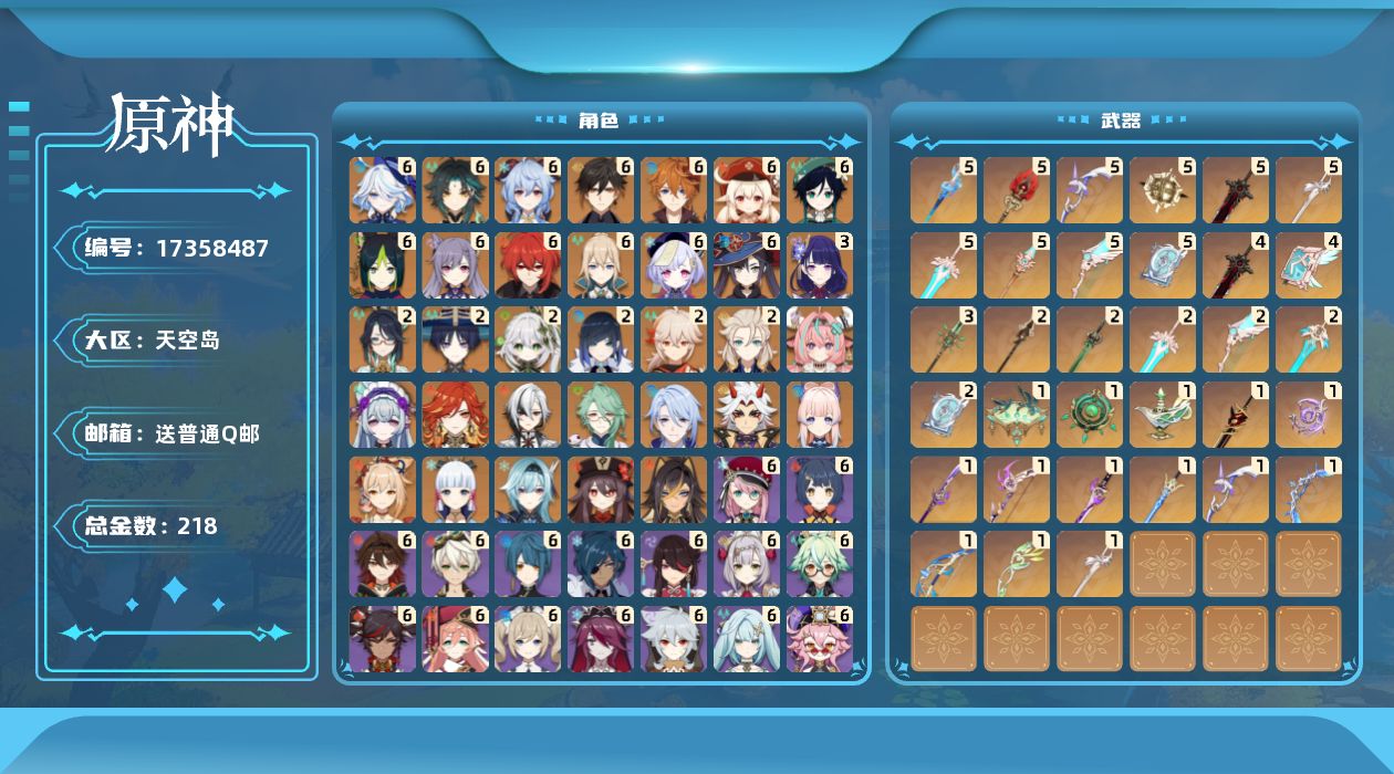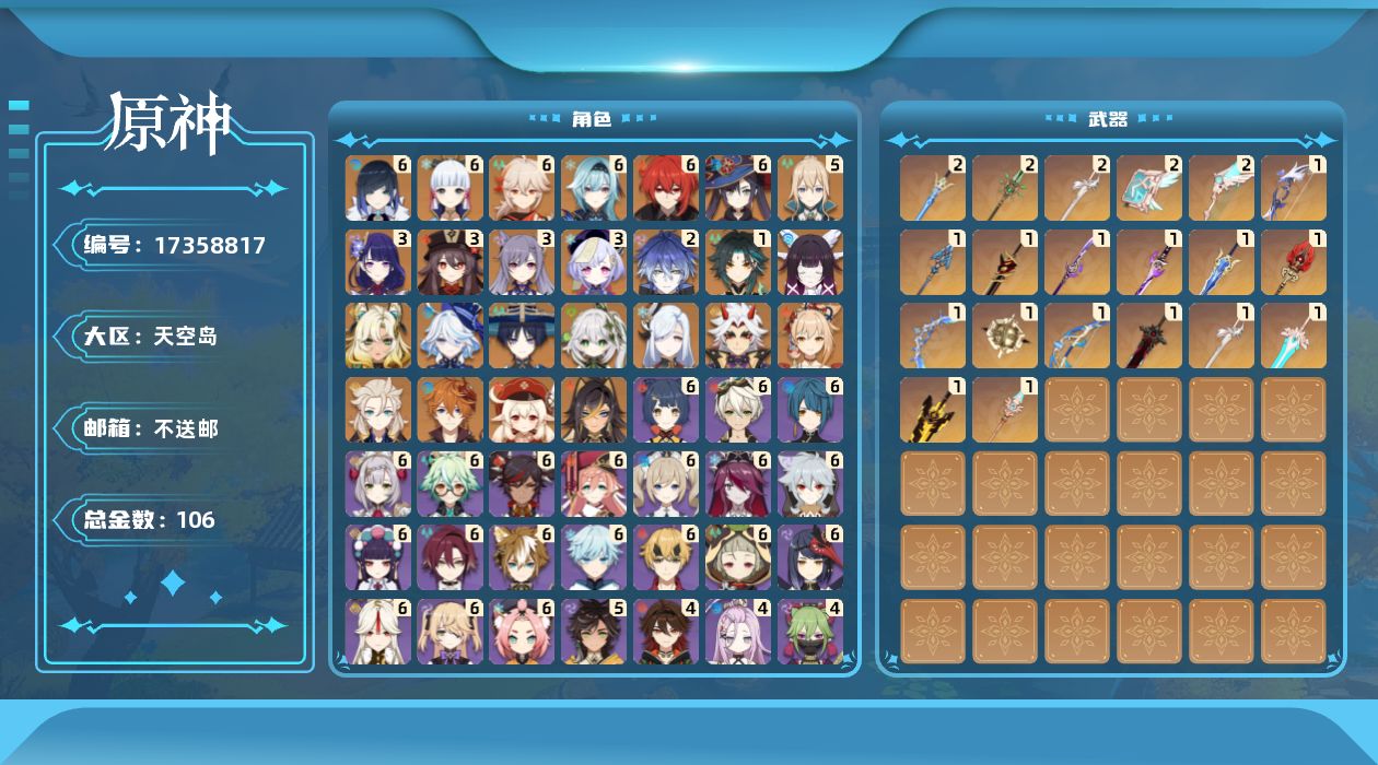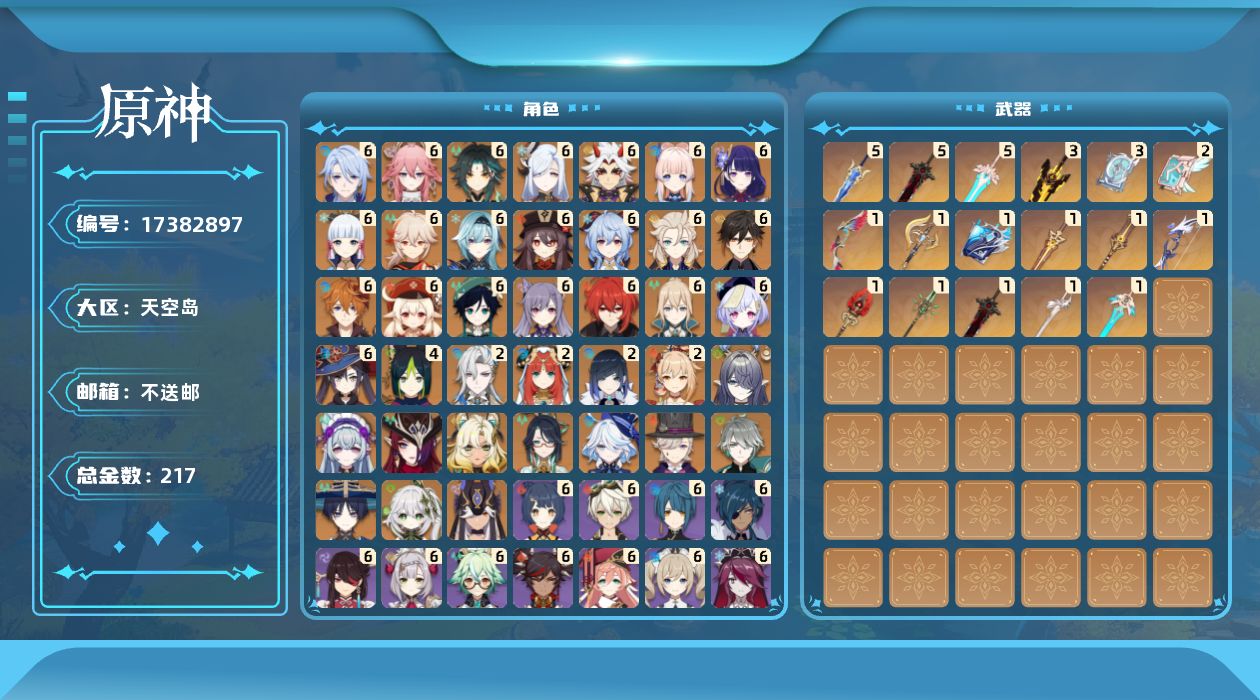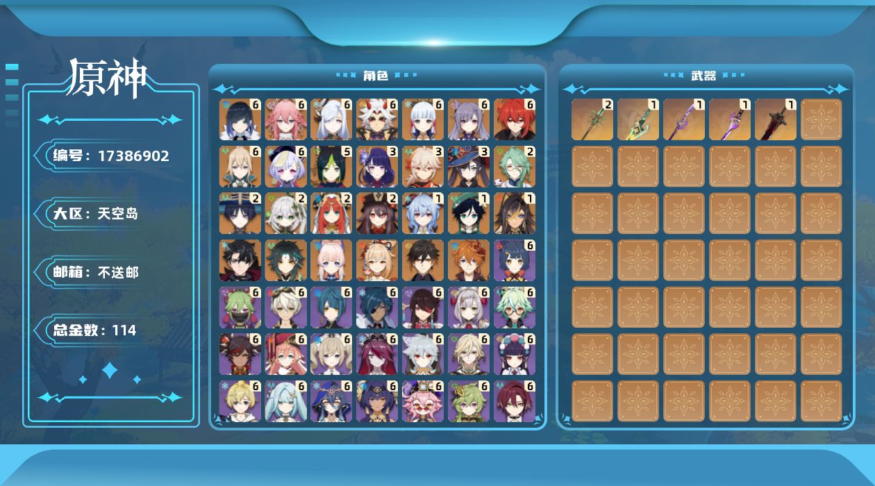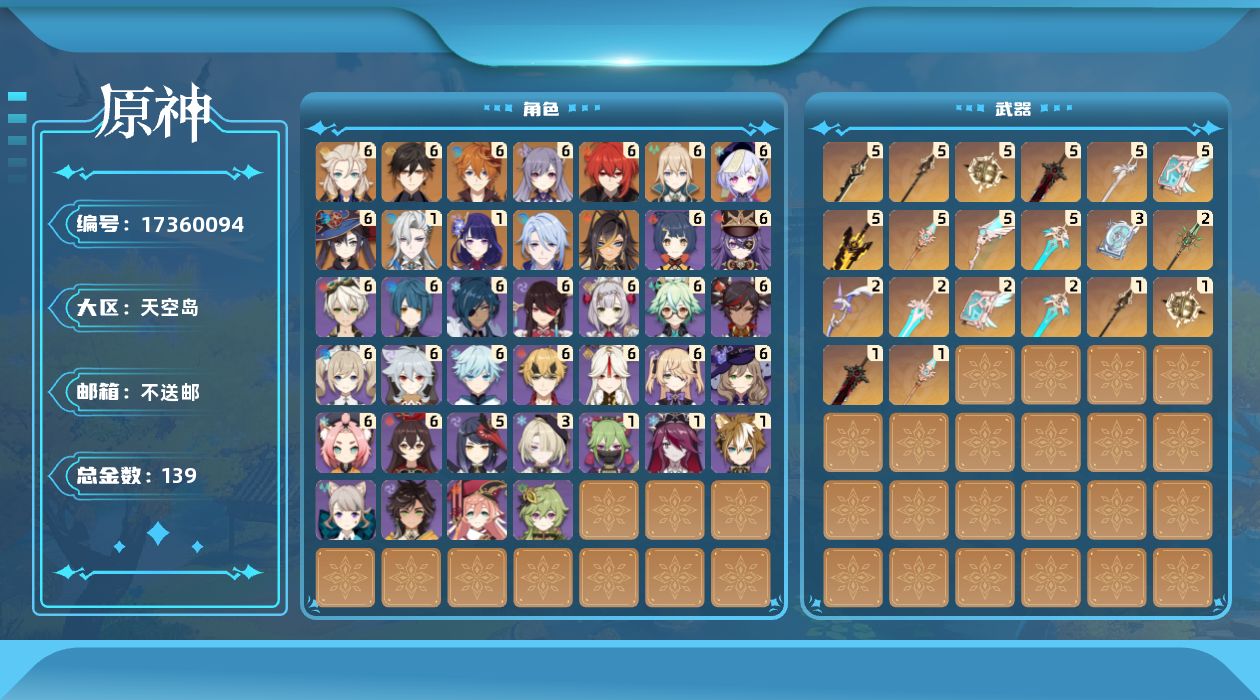 【C266597292】[17389214]0AQO6E总黄数182角色数量39武器数量14冒险等级60男主