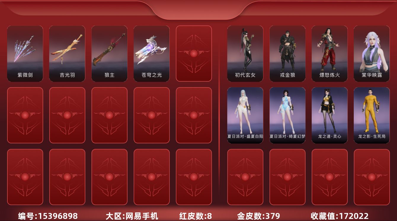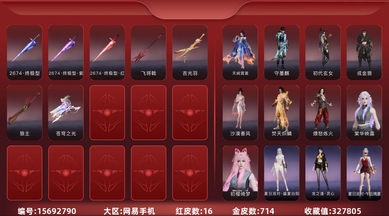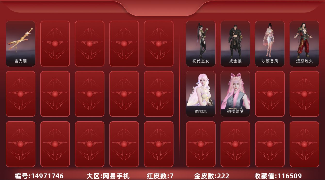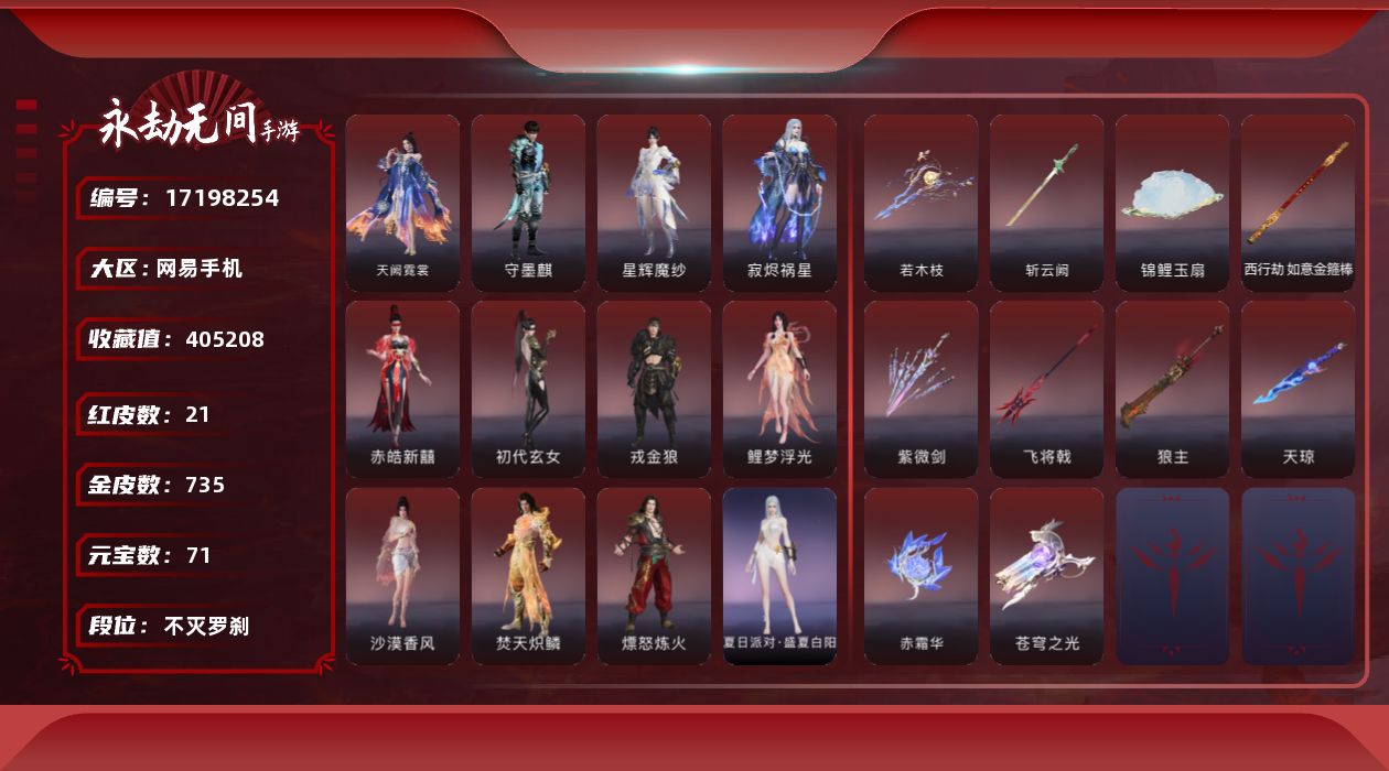 【C262498484】[16025251]WJ3772,网易手机手游,2月1日可换绑,四人段位铂金5,5红,77金,神君印,棠华映露,绯羽流风,锦鲤玉扇,沙漠香风,天琼,无拘,盛夏白阳,紫金宝剑,黑金古刀,星辉环月,雪国礼炮,恋念私语,悠竹萌客,