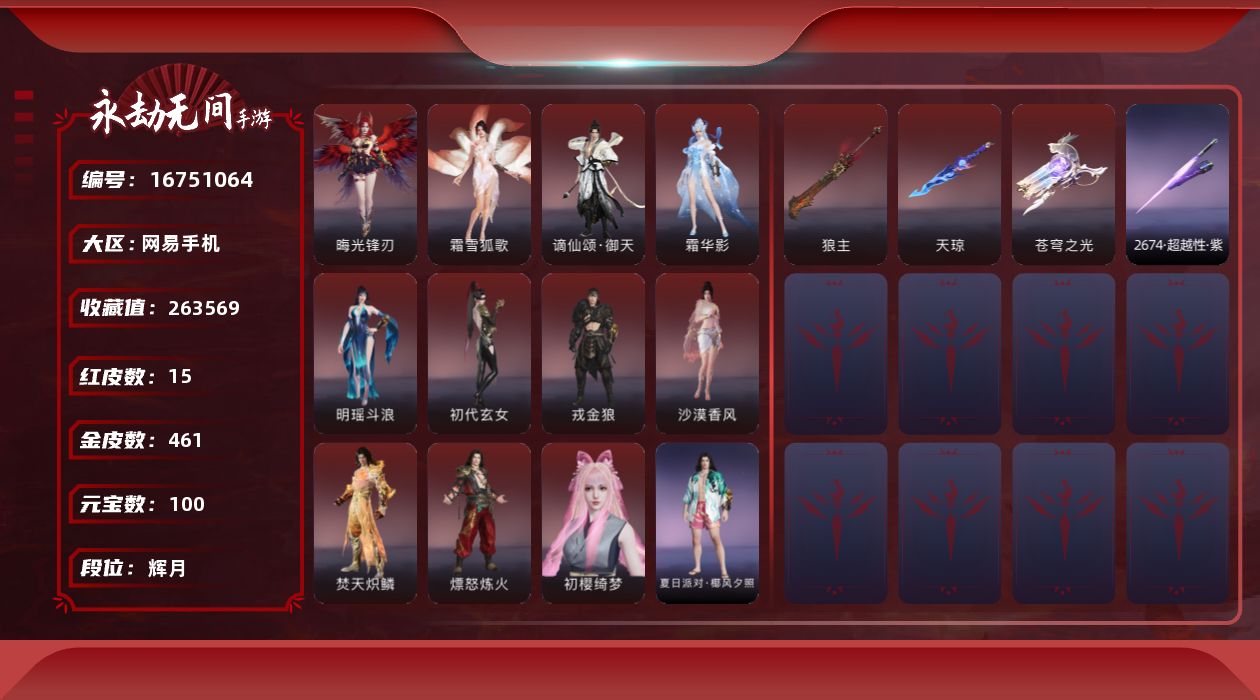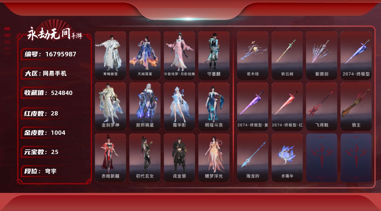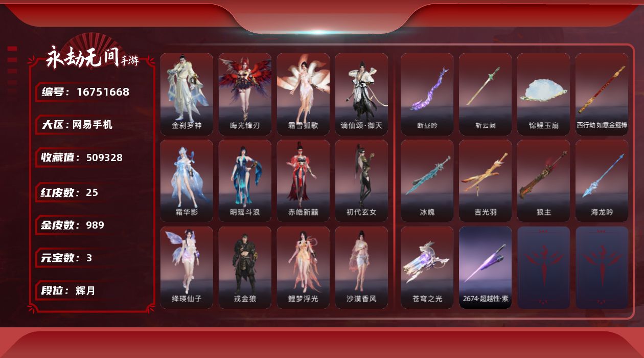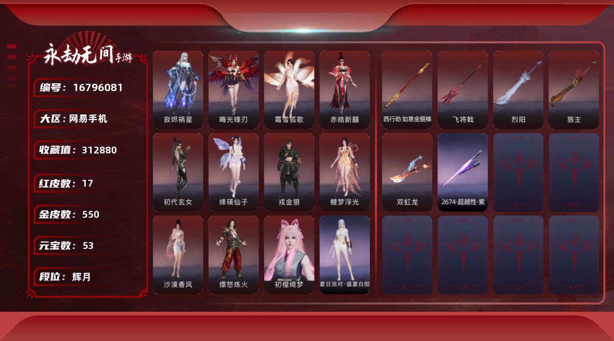 【C264480614】[16796081]WJ7287,网易手机手游,网易支付无法注销,3月17可换绑,四人段位辉月5,17红,550金,赤莲,凶虎,初樱绮梦,2674超越型紫,烈阳,狼主,飞将戟,如意金箍棒,双虹龙,绛瑛仙子,鲤梦浮光,晦光锋刃,霜雪狐歌,寂烬祸星,赤皓新囍,初代玄女,戎金狼,沙漠香风,熛怒炼火,精武魂,过江龙,无拘,盛夏白阳,高校水着,午后瑰夏,白鹿,击苍穹,九霄寒,兰庭月,少女心事,哪吒,玄霜仙兔,浣烟纱,雪魅星尘,腓腓,劫妹飞船,木棉,,