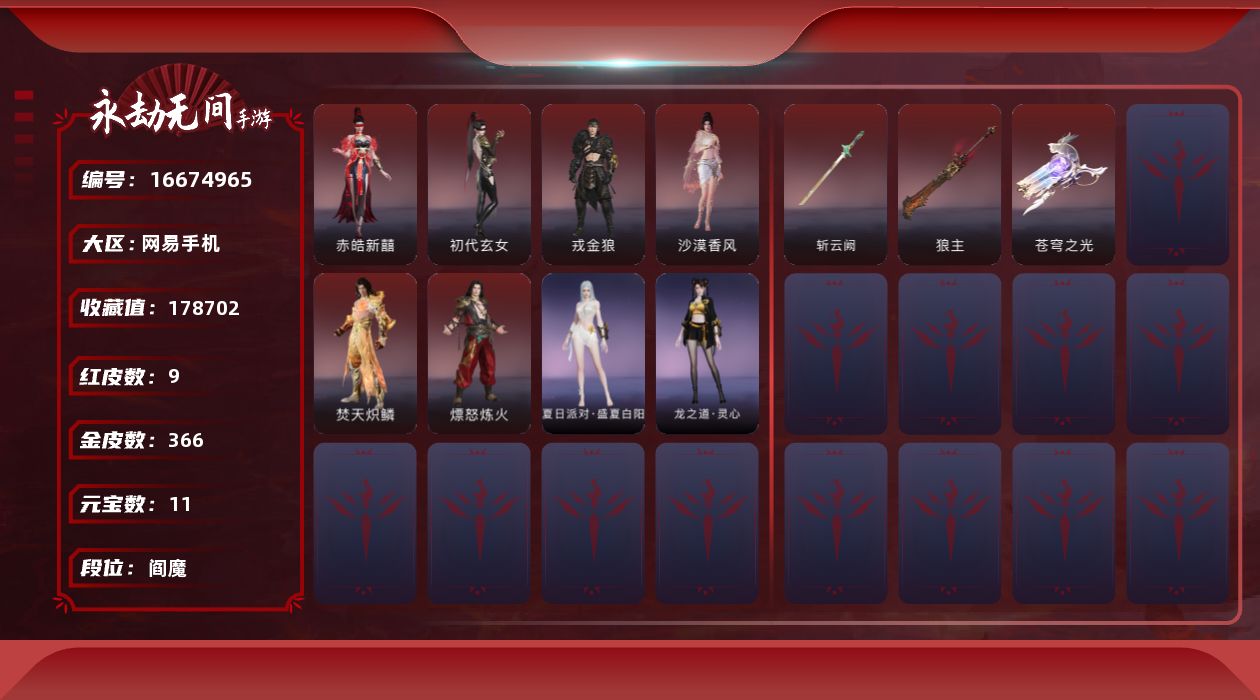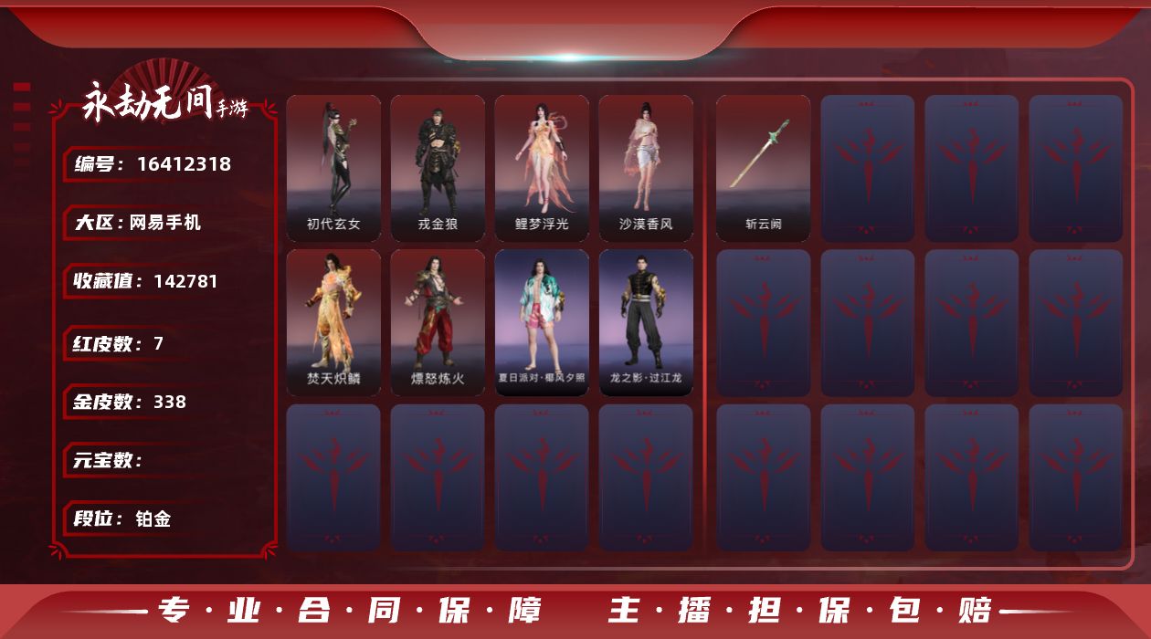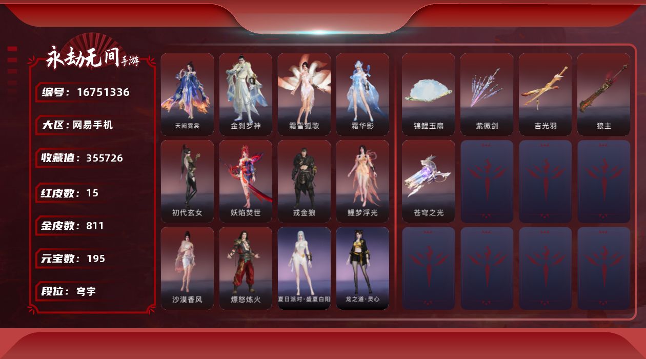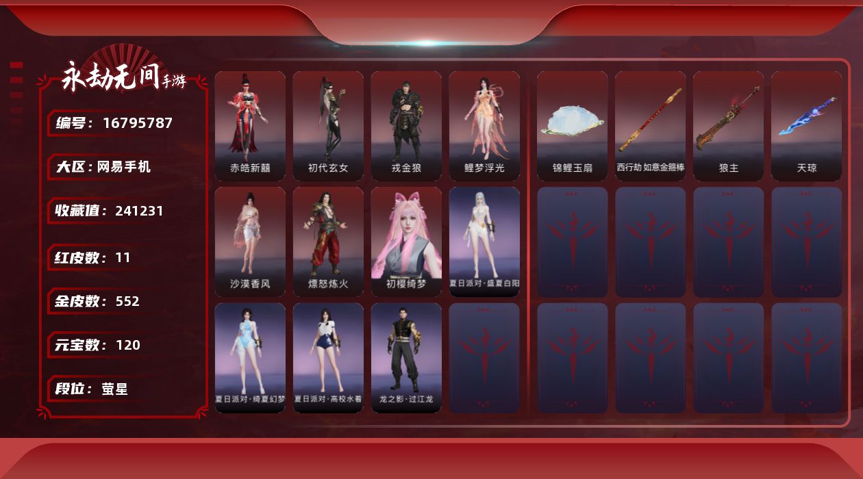 【C264480614】[16796081]WJ7287,网易手机手游,网易支付无法注销,3月17可换绑,四人段位辉月5,17红,550金,赤莲,凶虎,初樱绮梦,2674超越型紫,烈阳,狼主,飞将戟,如意金箍棒,双虹龙,绛瑛仙子,鲤梦浮光,晦光锋刃,霜雪狐歌,寂烬祸星,赤皓新囍,初代玄女,戎金狼,沙漠香风,熛怒炼火,精武魂,过江龙,无拘,盛夏白阳,高校水着,午后瑰夏,白鹿,击苍穹,九霄寒,兰庭月,少女心事,哪吒,玄霜仙兔,浣烟纱,雪魅星尘,腓腓,劫妹飞船,木棉,,