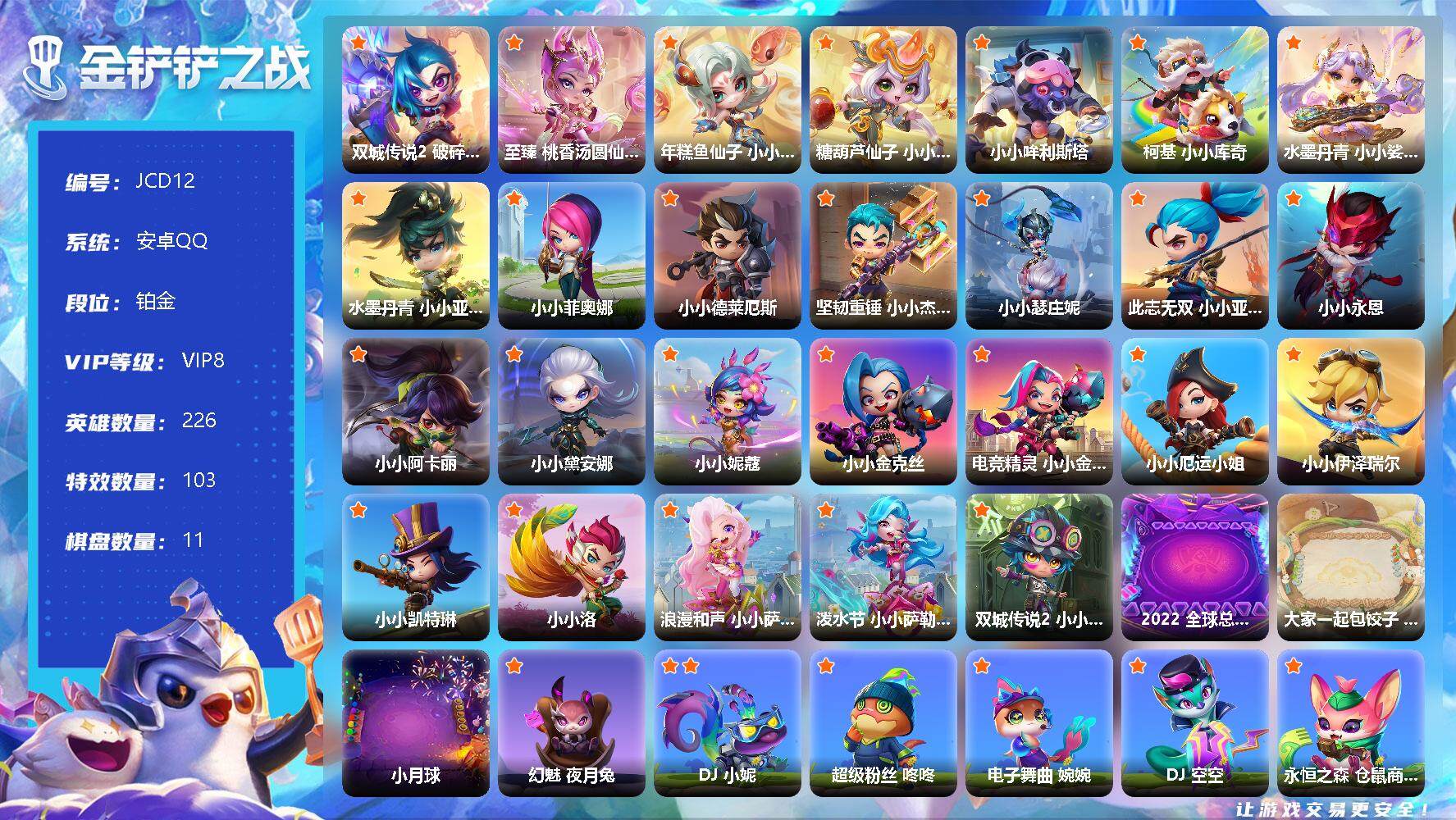 【C2530203694】【JCD12】8神话/226小小英雄/11棋盘/双城传说2 破碎者 小小金克丝/至臻 桃香汤圆仙子 小小辛德拉/年糕鱼仙子 小小卡莎/糖葫芦仙子 小小索拉卡/小小哞利斯塔/柯基 小小库奇/水墨丹青 小小娑娜/水墨丹青 小小亚索/小小菲奥娜/小小德莱厄斯/坚韧重锤 小小杰斯/小小瑟庄妮/此志无双 小小亚索/小小永恩/小小阿卡丽/小小黛安娜/小小妮蔻/小小金克丝/电竞精灵 小小金克丝/小小厄运小姐/小小伊泽瑞尔/小小凯特琳/小小洛/浪漫和声 小小萨勒芬妮/泼水节 小小萨勒芬妮/双城传说2 小小伊莎/2022 全球总决赛 此志无双/大家一起包饺子 竞技场/小月球/幻魅 夜月兔/DJ 小妮/超级粉丝 咚咚/电子舞曲 婉婉/DJ 空空/永恒之森 仓鼠商人/星之守护者 小马/科学狂 小妮/青花瓷 鳞珑/焰羽/鳞珑/魔影 夜月兔/歌姬 夜月兔/战斗学院 威老板/魔灵 软软/牧场奶牛 胖胖龙/远古巨龙 敖兴/胖石龙 胖胖龙/仙灵 软软/魔灵 喵卫/仙灵 喵卫/果味软糖 夜煞/斩月狼