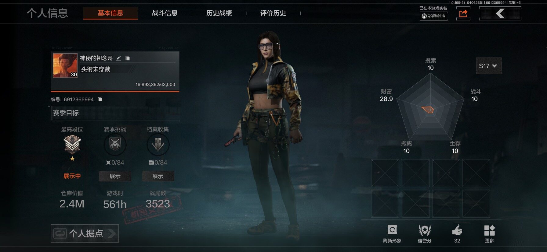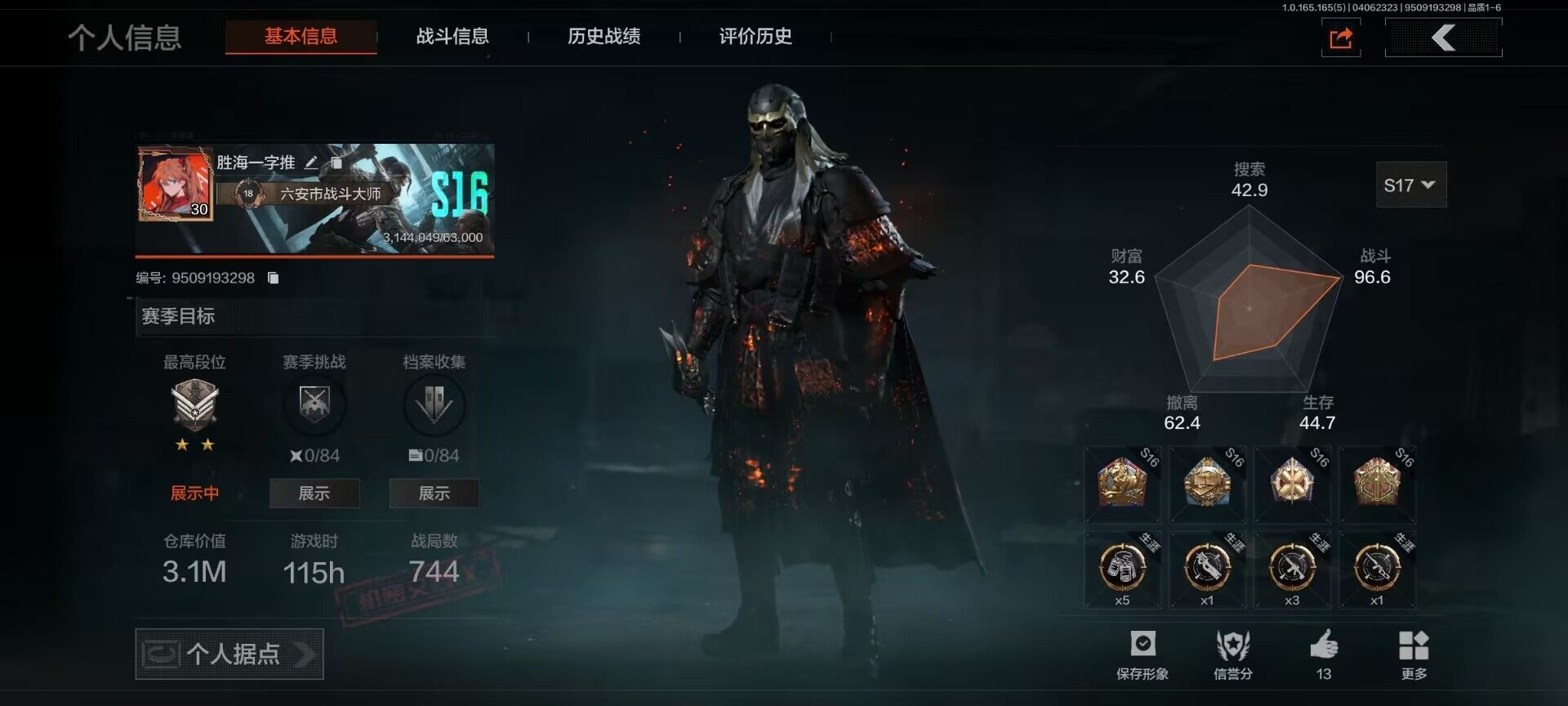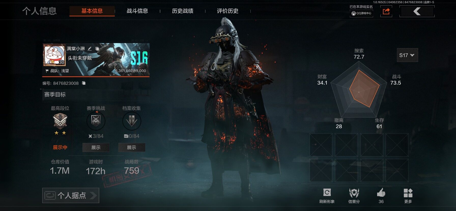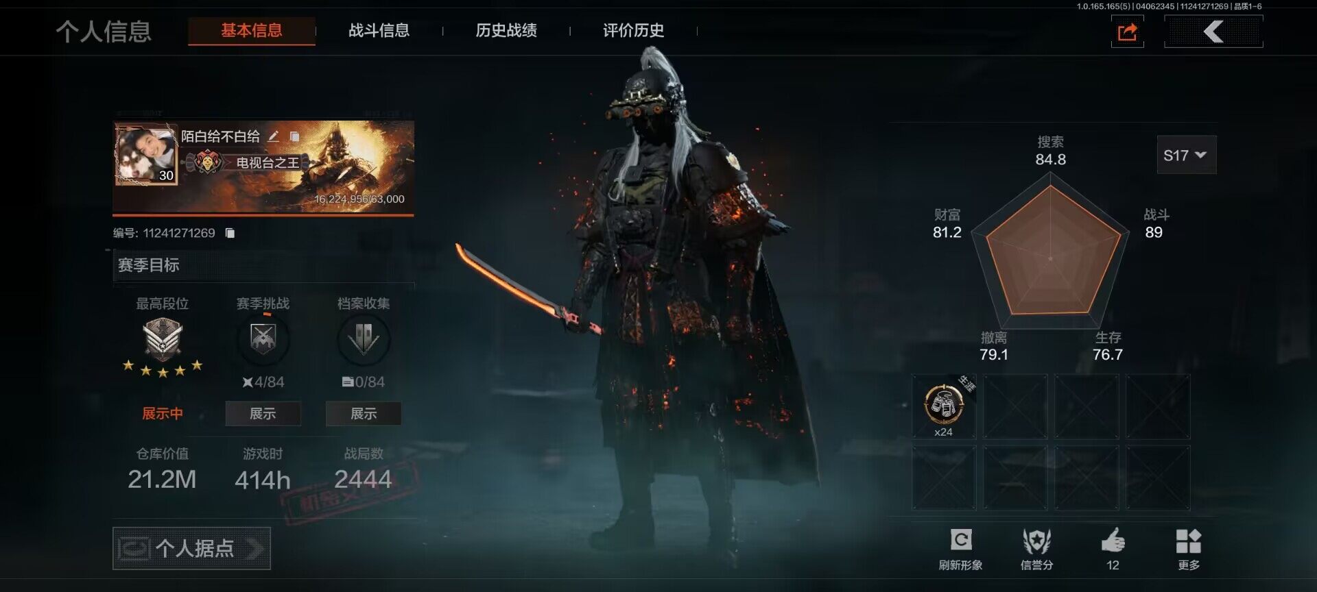【C269633075】【AQZG2087】等级:30/段位:大师/仓库价值(百万):1.7/柯恩币:614774/赤火炉心/蝮蛇/苍白隐者伪装服/长夜千军武将