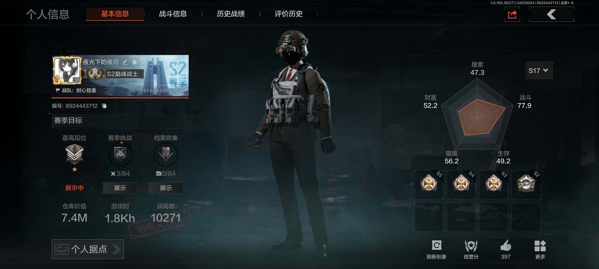 【C2610914974】【AQZG2291】段位:专家/仓库价值(百万):10.4/柯恩币:9925258/幽燕钛玄/利齿风暴MPX/玉擎天工MP5/伦琴幻影FAL/黑金弹头P90/旗帜AEK/近卫荣誉RPK16